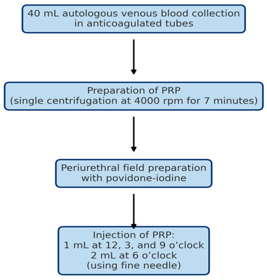 PRP procedure and preparation. Schematic representation of the platelet-rich plasma (PRP) preparation and injection procedure. A total of 40 mL of autologous venous blood was collected in anticoagulated tubes and centrifuged at 4000 rpm for 7 min. After periurethral field preparation with povidone-iodine, PRP was injected periurethrally using a fine needle: 1 mL at the 12, 3, and 9 o’clock positions, and 2 mL at the 6 o’clock position. PRP: Platelet-rich Plasma; rpm: rotations per minute; mL: milliliters.