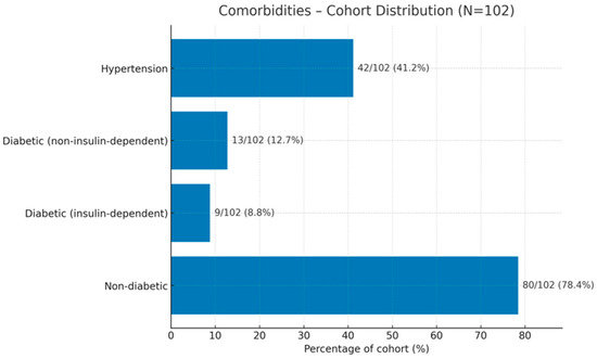 Comorbidities in the entire cohort and subgroups. Distribution of major comorbidities among participants. The majority of the cohort were non-diabetic (76.4%), followed by arterial hypertensive patients (41.2%), non-insulin-dependent diabetics (12.7%), and insulin-dependent diabetics (9.8%). Values are expressed as the number and percentage of patients within the total study population. N: number.