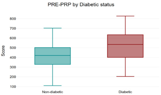 Diabetic status was not associated with differences in the baseline scores (p = 0.064) or post-PRP1 (p = 0.084), but diabetic participants reported significantly higher scores post-PRP2 (p = 0.023) and post-PRP3 (p = 0.042).