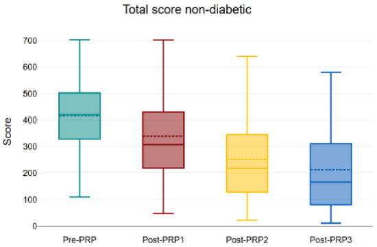 Among non-diabetic participants, scores declined from 55.94 to 46.35 post-PRP1, 37.40 post-PRP2, and 32.71 post-PRP3 (p < 0.001). Pairwise tests showed significant improvements versus baseline at all time points (all p ≤ 0.003), as well as between the first and second PRPs (p < 0.001) and post-PRP1 or the third PRP (p < 0.001); the difference between the scores post-PRP2 and post-PRP3 was not significant (p = 0.119).