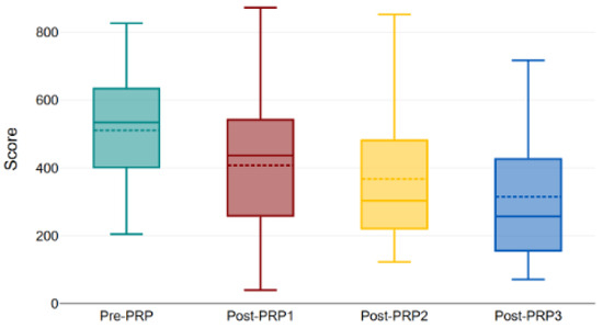 In the overall cohort, the mean score decreased from 33.33 at baseline (pre-PRP) to 22.22 at post-PRP1, 15.36 at post-PRP2, and 12.20 at post-PRP3 (p < 0.0001).