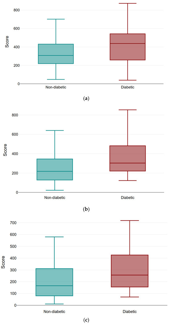 No statistically significant differences between diabetic and non-diabetic participants were observed at any time point (p = 0.89; p = 0.682; p = 0.795; p = 0.498, respectively).