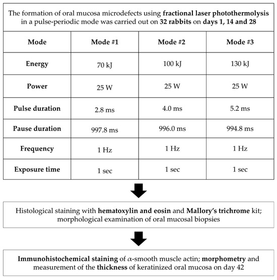 A total of 32 adult male grey chinchilla rabbits (3.5–4.0 kg) were used to evaluate the effects of fractional laser irradiation on keratinized oral mucosa in different operating modes of a 1550 nm laser (maximum power 25 W) (Figure 1). Animals were housed in a certified vivarium under standard laboratory conditions in accordance with good laboratory practice for preclinical studies (GOST R50258-92, GOST 351000.3-96, GOST 51000.4-96). The environment was maintained at room temperature with a 12 h light/dark cycle, and animals had free access to pelleted feed and water. Before each procedure, rabbits were weighed and anesthetized by intramuscular administration of Rometar (3 mg/kg) and Zoletil (5 mg/kg).