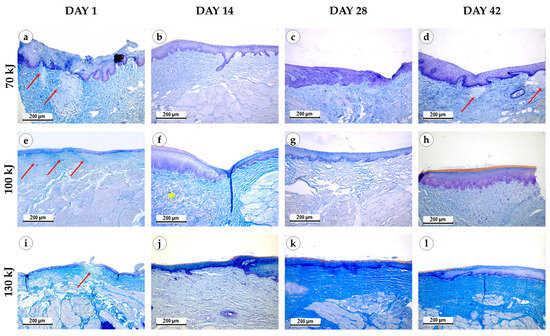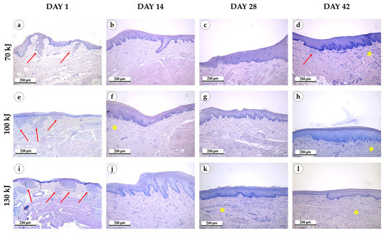 Morphological study of the gingival samples after photothermolysis with 1550 nm fractional laser. The experimental groups were divided by the laser energy 70 kJ (a–d), 100 kJ (e–h), 130 kJ (i–l), stained with hematoxylin and eosin, magnification ×200, arrow—fibrinoid necrosis, star—neoangiogenesis.