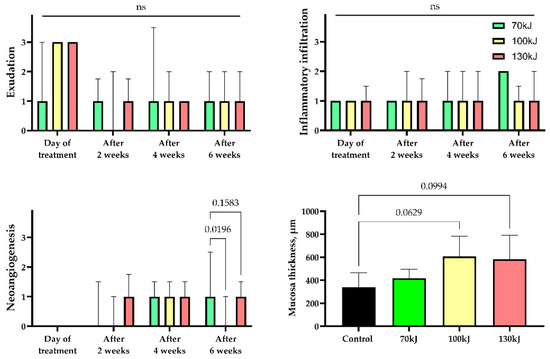 Statistical analysis of histological features of inflammation and regeneration in areas of laser treatment. Exudation, inflammatory infiltration, neoangiogenesis—median values ± interquartile range. Thickness of mucosa—mean ± SD, n.s.—not significant.