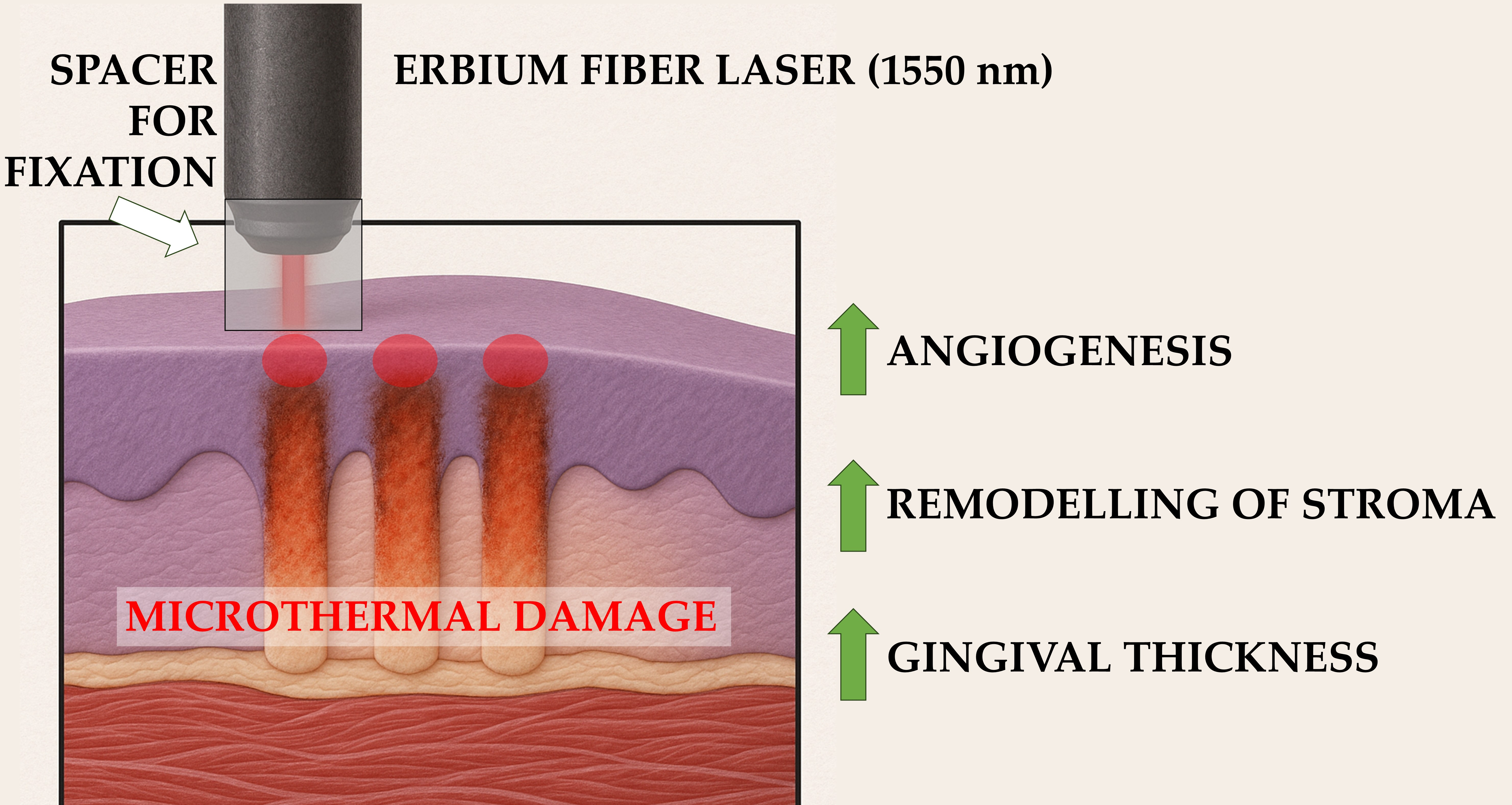 To the best of our knowledge, this is the first controlled experimental study to investigate the effects of a 1550 nm fractional Er fiber laser on oral mucosa in dentistry. Previous work in the field evaluated ex vivo porcine tissues and a small clinical series of two patients, demonstrating that laser parameters such as pulse energy, beam diameter and beam divergence could reliably produce microcolumns up to 800 μm in depth and suggesting the feasibility of fractional systems for gingival regeneration [