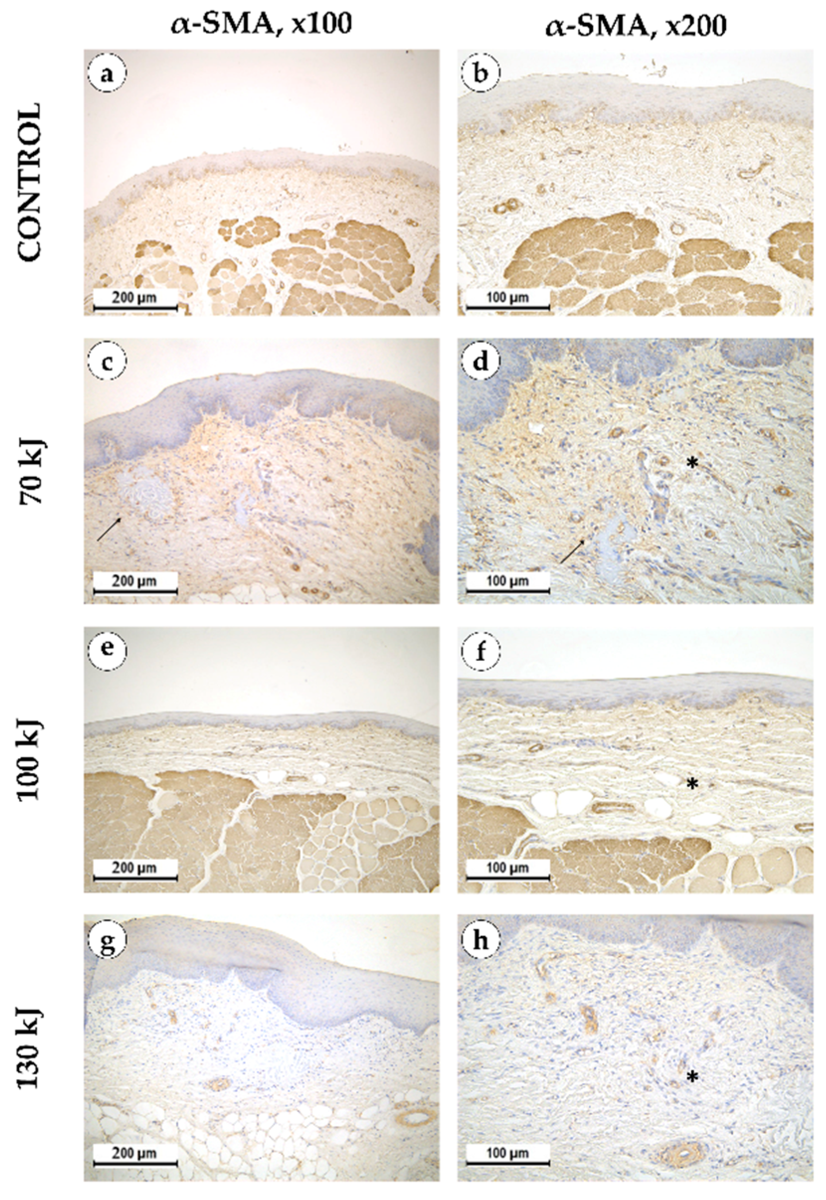 α-smooth muscle actin in intact gingical tissue (a,b) areas treated with 70 kJ (c,d), 100 kJ (e,f) and 130 kJ (g,h) lasers six weeks after treatment. Immunohistochemical reaction with antibodies against α-smooth muscle actin with hematoxylin counterstaining, magnification ×100 (left column), ×200 (right column), arrow—healing laser treatment area, star—neoangiogenesis.