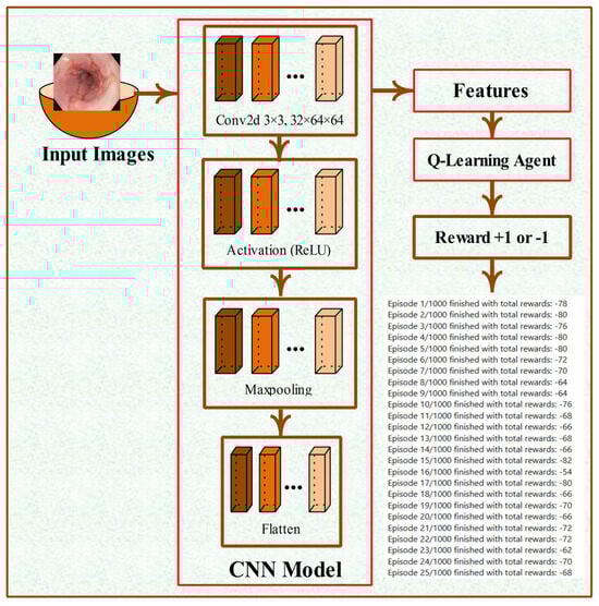 The proposed model employs well-established concepts such as CNNs, Q-learning, and Attention U-Net, the originality of our work lies in the innovative integration and synergistic interaction of these components within a unified two-phase architecture designed specifically for gastrointestinal ulcer analysis. Existing studies, such as the SAC model [] and Vision Transformer-based frameworks [], have focused on improving either classification accuracy or feature representation within a single-task setup. Similarly, deep CNN-based approaches like VGG19 and ResNet variants [] primarily rely on transfer learning to enhance classification but lack a mechanism for adaptive decision-making or lesion-focused segmentation refinement. In contrast, our proposed Q-learning-enhanced CNN introduces a reinforcement-driven optimization process, where a Q-table maps extracted feature states to optimal classification actions through continuous reward feedback, resulting in a dynamically adaptive and context-aware classifier.
