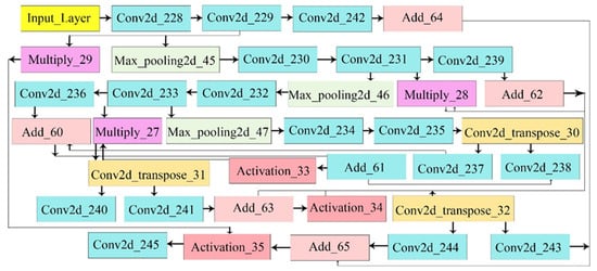 This operation reduces spatial dimensions by a factor of two. For up-sampling, transposed convolutions are used, as shown in Equation (19):