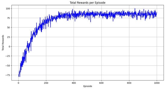 In Figure 4a, the matrix reveals perfect classification, as all the values lie on the main diagonal. Specifically, the model accurately predicted 500 instances of A-0, 2700 instances of B-1, 975 instances of C-2, and 1350 instances of D-3, with no misclassifications or confusion between classes. This diagonal dominance confirms that the model achieved 100% accuracy in identifying each class. Figure 4b visualizes the classification report using an F1 Score chart. The uniform height and shading of the bars across all classes indicate consistent and perfect performance. The chart emphasizes that the model treated each class equally well, with no variation in classification quality. Together, these two figures demonstrate that the proposed model performed flawlessly on the Nerthus dataset, with complete accuracy and ideal precision–recall. This suggests either highly distinguishable data features within the dataset or a model exceptionally well-suited to the task. The model’s performance in terms of reward is visualized in Figure 5.