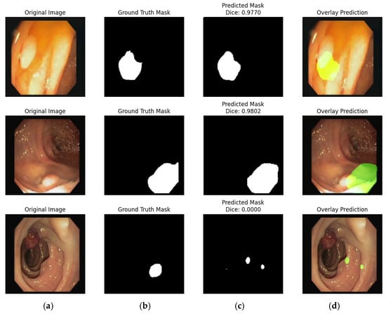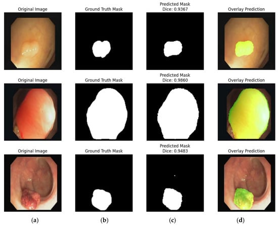 Illustration of segmentation on the Kvasir Dataset: (a) Original Image; (b) Ground Truth; (c) Model Prediction; and (d) Overlay Prediction.