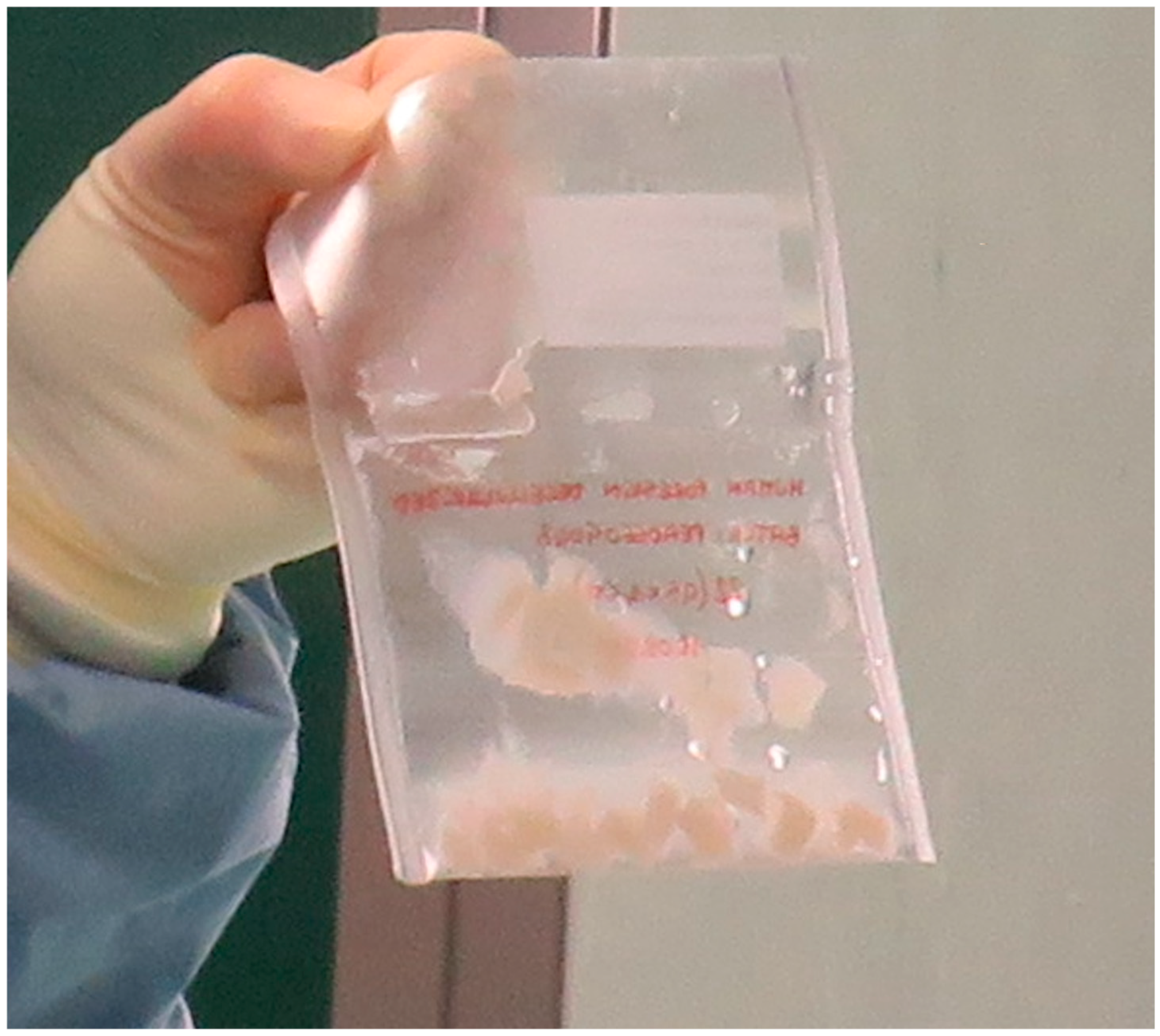 The scaffold was produced by Purpura and colleagues [18] at the Emilia Romagna Regional Skin Bank. Briefly, the foreskin was harvested from adult human donors for therapeutic purposes. The harvest foreskin was placed in RPMI 1640 medium (Biowest, Riverside, MO, USA), antibiotics, and 10% cryoprotectant (CRYO·ON DMSO; Alchimia, Ponte San Nicolò, Italy) and frozen at −80 °C.