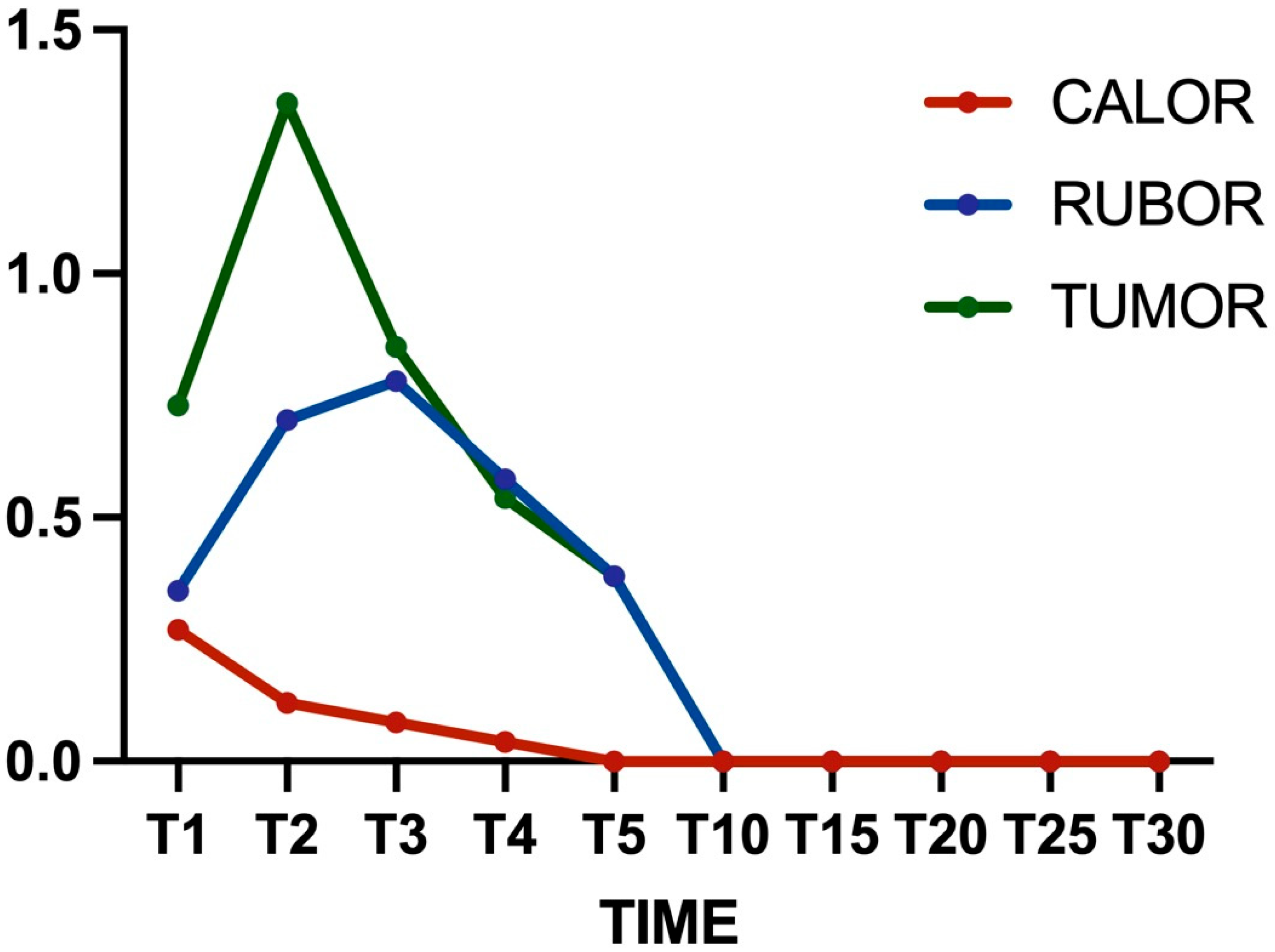 Figure 3. Graphical representation of calor, rubor, and tumor scores at different times during the study. The score (0–3) is indicated on the y-axis, and the time since the surgery is on the x-axis. The tumor score changed moderately 2 days post-implantation but decreased in the follow-ups (green line).