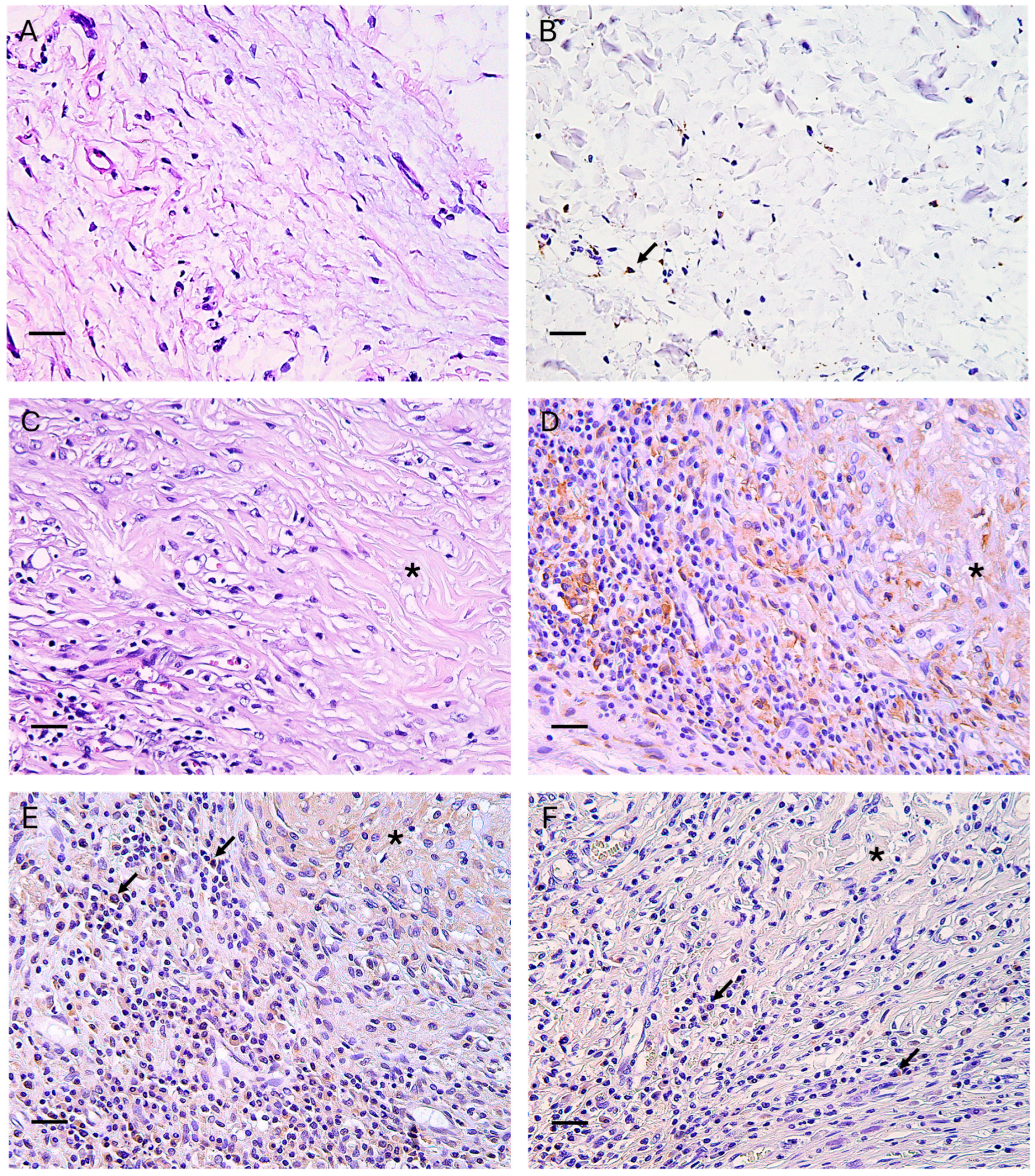 Figure 5. Histological aspect (A) and Iba-1 immunohistochemical labeling (B) of healthy skin from the control group. Few resident macrophages are labeled with the Iba-1 marker. (C) Histological aspect of the implanted scaffold (asterisk) and surrounding tissues at 30 days post-implantation. The scaffold is surrounded by a diffuse inflammatory reaction; macrophages and eosinophils are visible (H&E stain, scale bar = 50 μm). (D) Immunohistochemistry reveals many Iba-1+ macrophages, frequently located in perivascular areas. (E) In a large percentage, Iba-1+ macrophages are also positive for iNOS (black arrows), indicating prevalent M1 polarization. (F) A few macrophages show CD204 positivity (black arrows), a typical marker of M2 differentiation. (BF), IHC stain, Harris’s hematoxylin nuclear counterstain; scale bars = 50 µm.