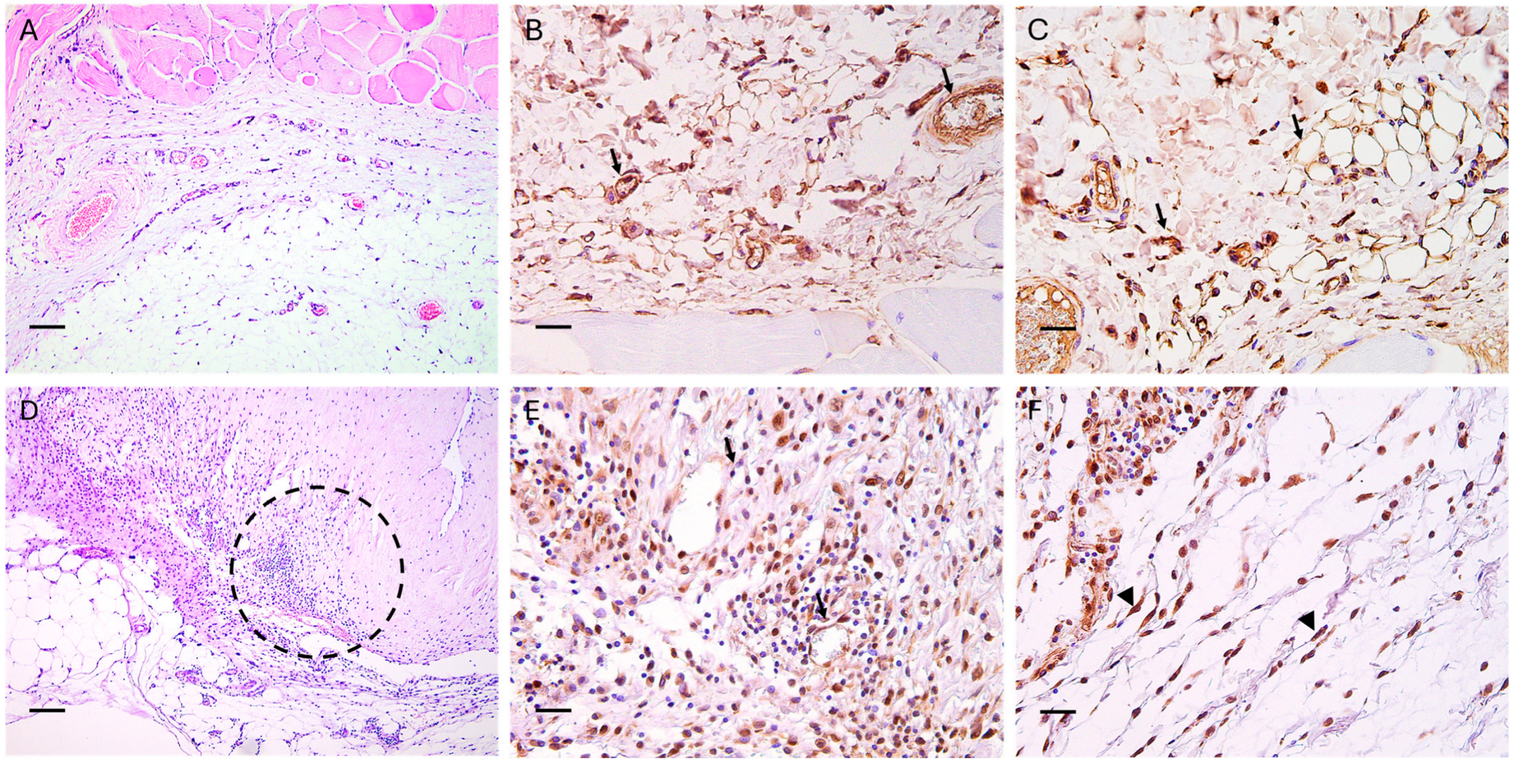 Figure 7. (A) Histological presentation of healthy skin. (B) Normal expression of anti-Factor VIII antibody by arteries and capillaries (black arrows) and (C) of anti-vimentin antibody by mesenchymal cells in the tissue, vessels, and hepatocytes membrane (black arrows). (D) Histological presentation of the scaffold surrounded by moderate inflammatory reactions and cell proliferation 30 days post-implantation (H&E stain, scale bar = 100 μm). (E,F) Higher magnification of the hypodermis–scaffold interface showing cell proliferation and infiltration (circle). Slight neo-angiogenesis is evident (black arrows) after immunohistochemical staining with anti-Factor VIII antibody (black arrows) (E). Anti-Vimentin-stained tissues show multiple cells with marked labeling (arrowheads), indicating fibroblastic proliferation (F). The abundant cellularization (circle) (D), microvessels (E), and fibroblasts (F) are not associated with a capsule or a net demarcation between the scaffold and the hypodermis, indicating the overall integration of the scaffold and not a foreign body reaction. IHC staining, Harris’s hematoxylin nuclear counterstain; scale bars = 50 µm.