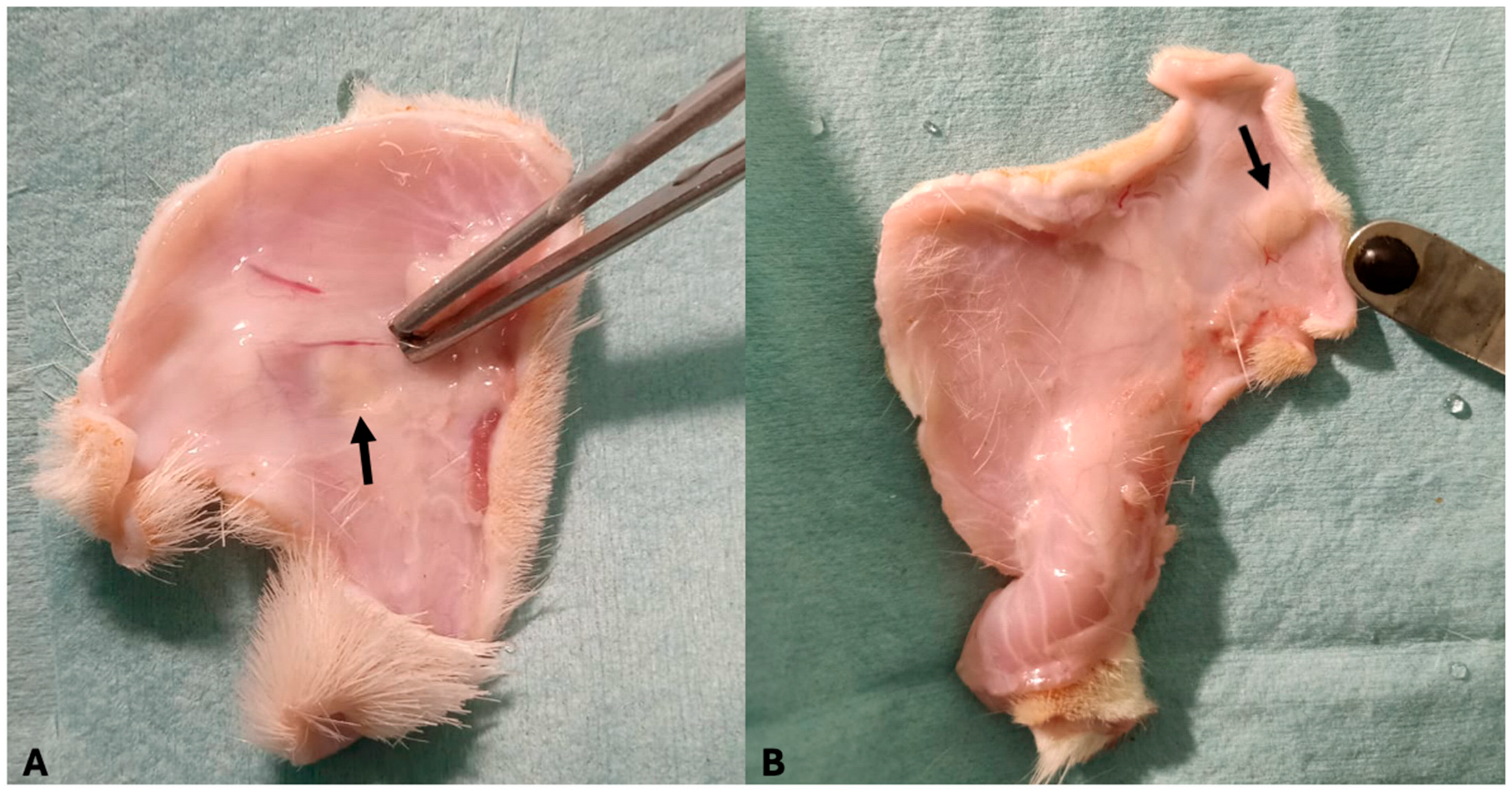 Figure 8. (A,B) Skin biopsy performed after 30 days on two rats. The presence of a capsule or cavity formation around the decellularized scaffold (black arrow) was absent.