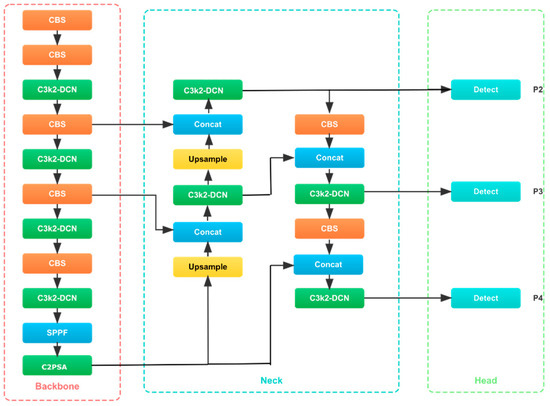 where and are convolutional kernels, is the activation function, and is the bias term. The C3k2 blocks enhance feature extraction while reducing computational costs.