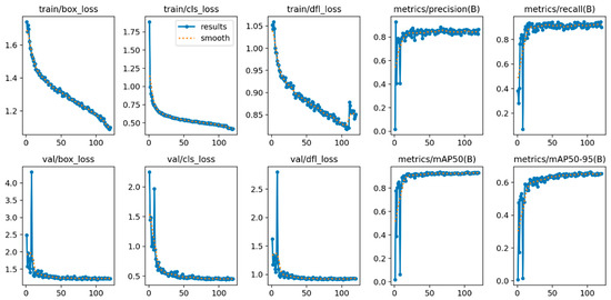 Training Loss and Metric Curves: Loss and performance metrics over training epochs, showing improvement in detection accuracy (The x-axis represents the training epochs, and the y-axis represents the corresponding loss or metric values).