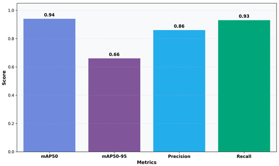Detection Performance Metrics: Bar chart showing mAP50, mAP50-95, precision, and recall scores.
