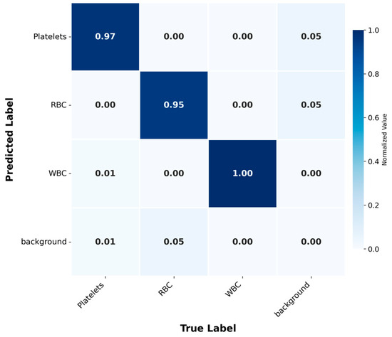 Further analysis of the confusion matrix (Figure 6) confirmed the high performance of the model, with classification accuracies of 0.97, 0.95 and 1.00 for platelets, RBCs and WBCs, respectively. The background category was identified with high accuracy, and misclassification was rare. This result indicates that the model has the ability to effectively distinguish between blood cell types and background. This high-precision classification is of great significance for clinical diagnosis, because the accurate distinction between these categories may directly affect the treatment effect of patients.
