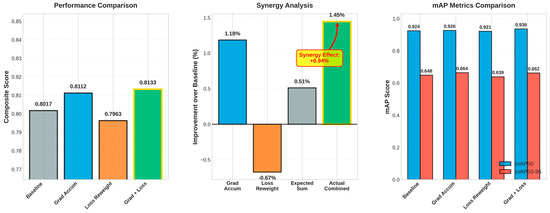 In the integrated setup, the Grad + Loss model achieved best results, achieving a composite score of 0.8133 (+1.45%), mAP50 of 0.9356 (+1.24%), and mAP50–95 of 0.6620 (+2.08%). It improved precision (0.8604) and recall (0.9251) compared with the baseline. The observed composite improvement (+1.45%) exceeded the anticipated additive gain (+0.51% = 1.18% − 0.67%), yielding a synergy of +0.94% (Figure 7). This suggests that gradient accumulation stabilizes the optimization, enabling loss reweighting to prioritize underrepresented or ambiguous cell instances without undermining calibration.