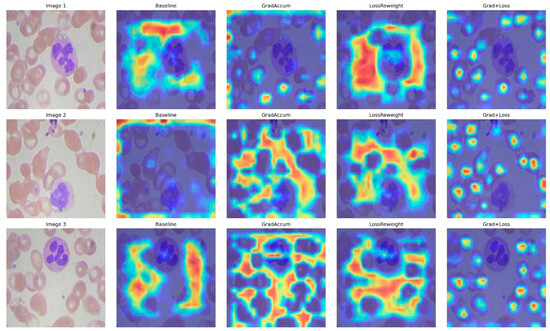 To understand why the integrated technique yields optimal results, Eigen-CAM visualizations reveal that the baseline exhibits dispersed attention and frequently encroaches on background erythrocytes (Figure 8); Gradient Accumulation alone results in wider yet more uniform activation, occasionally accompanied by peripheral artifacts; Loss Reweighting alone focuses on a limited number of high-contrast areas, neglecting boundaries; the integrated model generates compact, nucleus-centric attention while diminishing background responses and achieving clearer delineation in congested environments, and consistent with the enhanced precision, sustained recall, and elevated mAP50–95. The lack of focus on WBCs is due to the model detecting them using different, lower-level features that may not correspond to the high-activation regions shown in Eigen-CAM.