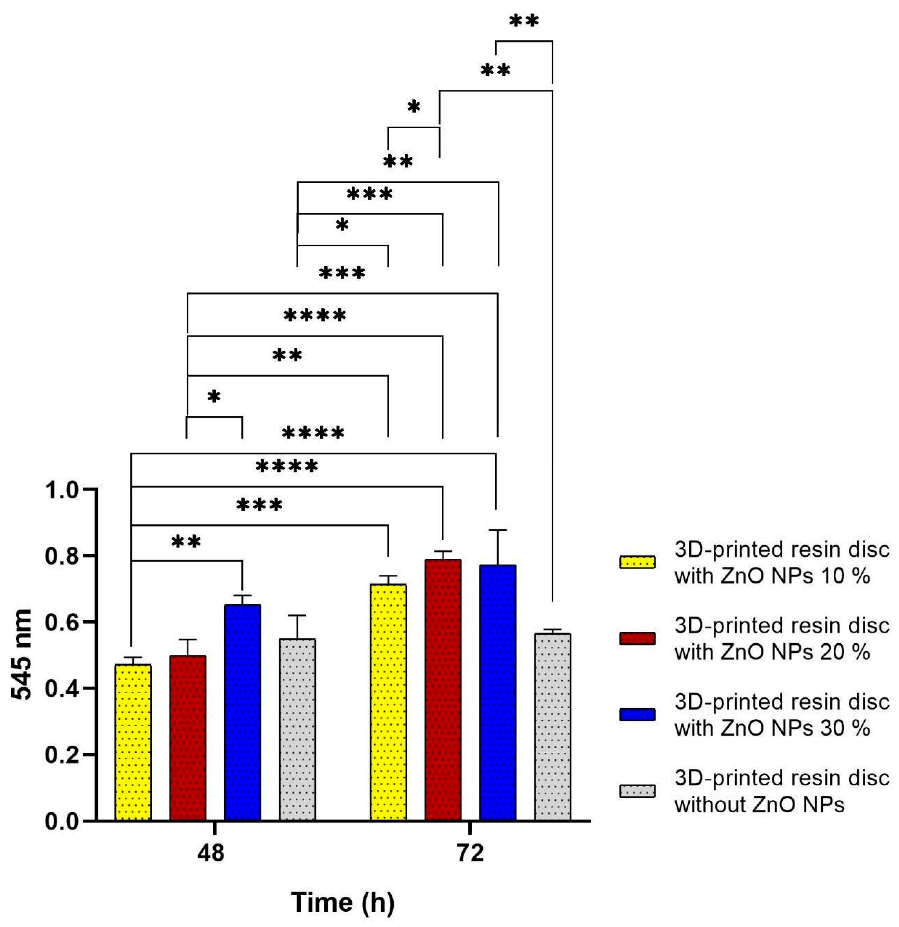 | Resin disc coated with 30% ZnO NPs | 8.10 ± 0.70 |