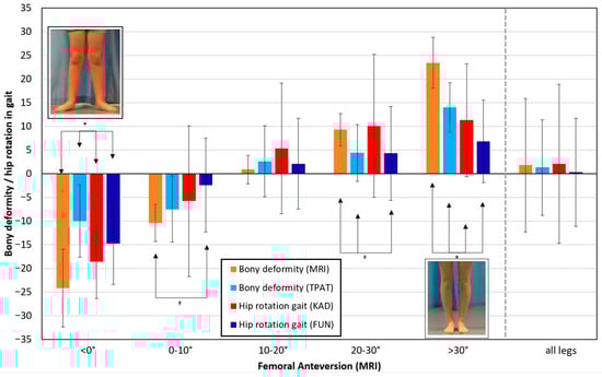 All 80 legs were classified into five subgroups according to MRI measurement, showing femoral anteversion of <0°, 0–10°, 10–20°, 20–30°, and >30°, respectively. The respective group sizes were 11, 16, 19, 17, and 17 legs. Figure 1 shows the deviation from the typical femoral anteversion angle of 15° [] for each subgroup in. (Orange: bony deformity MRI; light blue: bony deformity TPAT). Furthermore, mean hip rotation in stance is shown (red: KAD; dark blue FUN). In the subgroup with a typical femoral anteversion angle of 10–20°, the measures largely match, with substantial variation in hip rotation (error bars). In cases of femoral retroversion (<0°) and in cases with severely increased femoral anteversion (>30°), the bony deformity according to TPAT is significantly underestimated compared to the MRI measures (p < 0.001 in both comparisons). Both functional measures (KAD and FUN) deviate similarly, albeit to a lesser extent (p = 0.045, and p = 0.046, respectively), with less variation in the FUN measures (error bars).