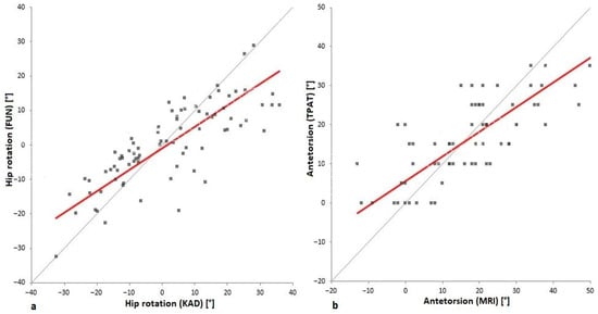 Linear regression (in red) according to Deming [] was obtained for hip rotation in stance ((a); KAD versus FUN) and for femoral anteversion ((b); MRI versus TPAT). The additional thin grey line indicates unity and serves as a guide for the eye only.