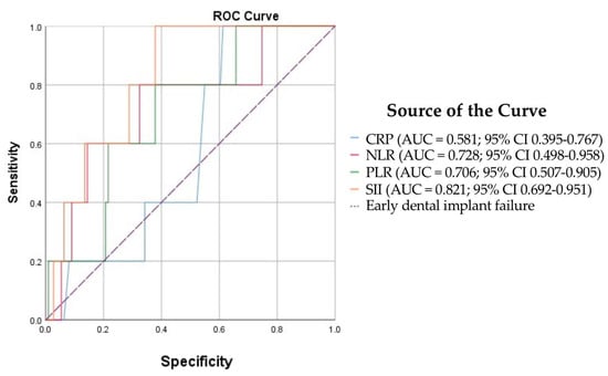 Clinically, in systemically healthy patients, routine preoperative screening based solely on blood inflammatory biomarkers, NLR, PLR, and CRP, did not enhance the assessment of early implant failure risk. Conversely, SII demonstrated good, statistically significant discriminatory ability and may have supplementary value. Notably, mean biomarker levels remained within reference ranges, a detail that could be overlooked during routine laboratory interpretation. Well-designed prospective studies are required to validate SII and clarify the predictive utility of blood biomarkers for early implant failure.
