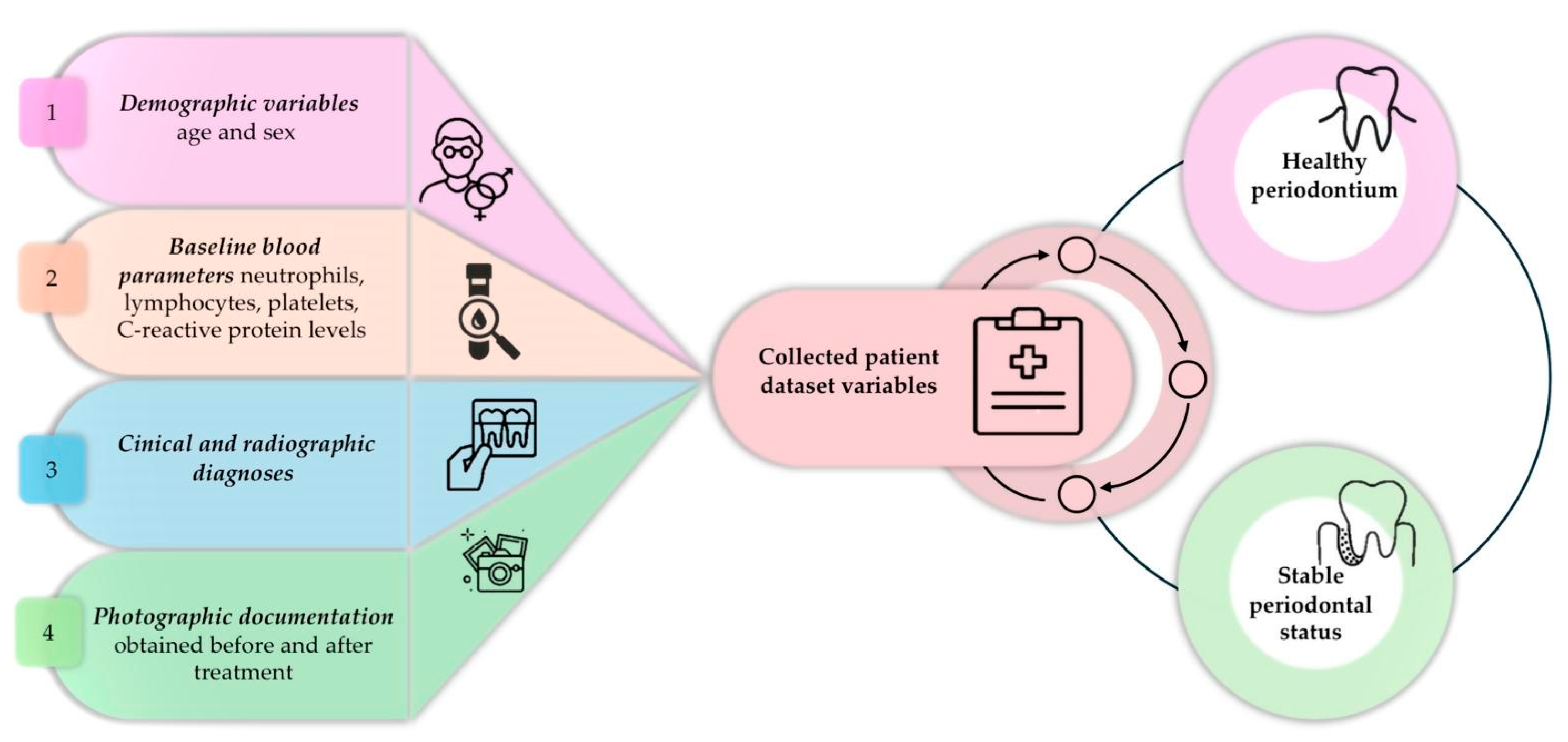 - periodontal status: either periodontal health or stable periodontal status, defined by a history of periodontitis with <10% bleeding sites and probing depths ≤ 3 mm over the past 6 months [29];