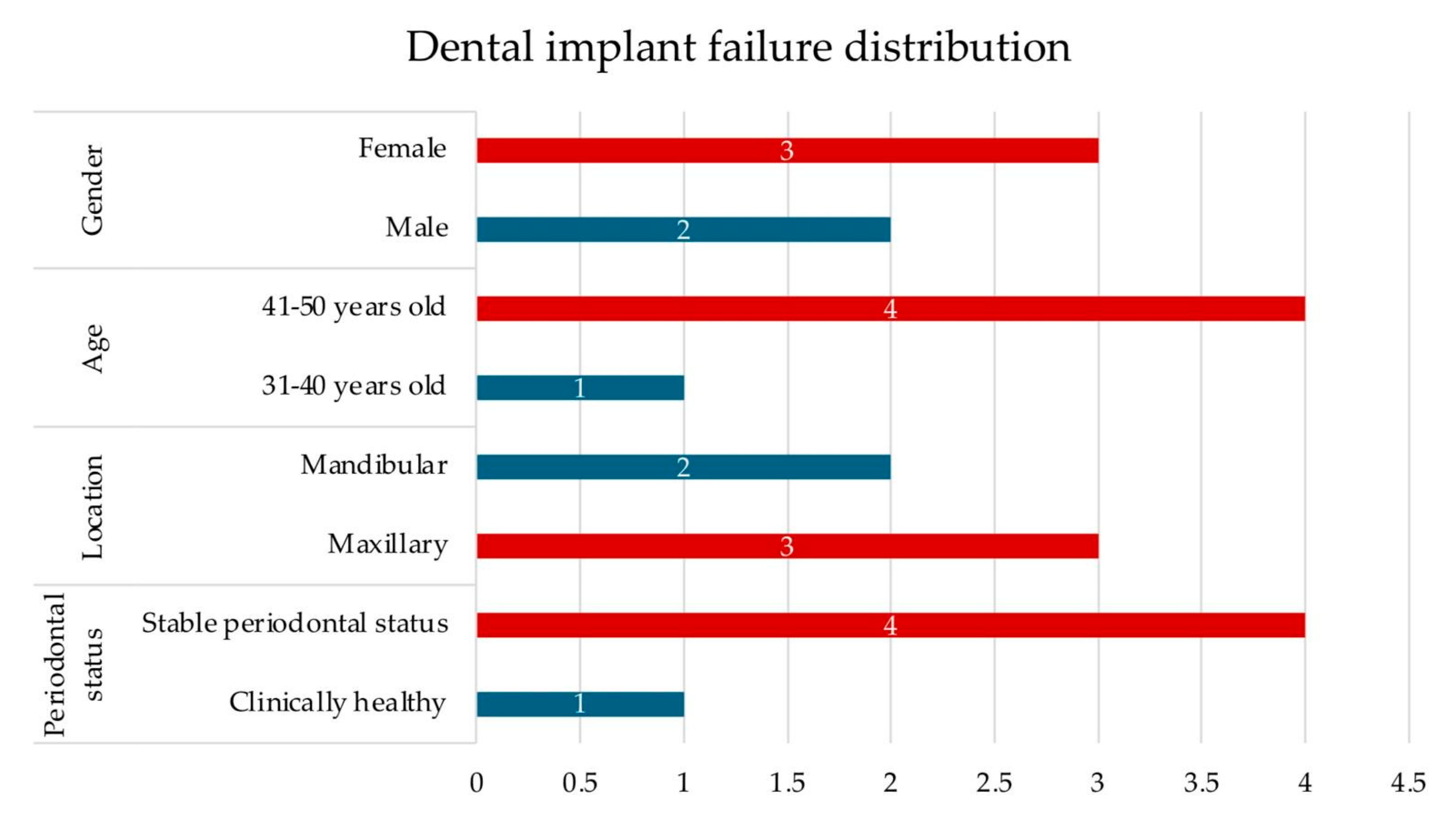 | Baseline Clinical Parameters | Dental Implant Survival | Dental Implant Failure | ||||