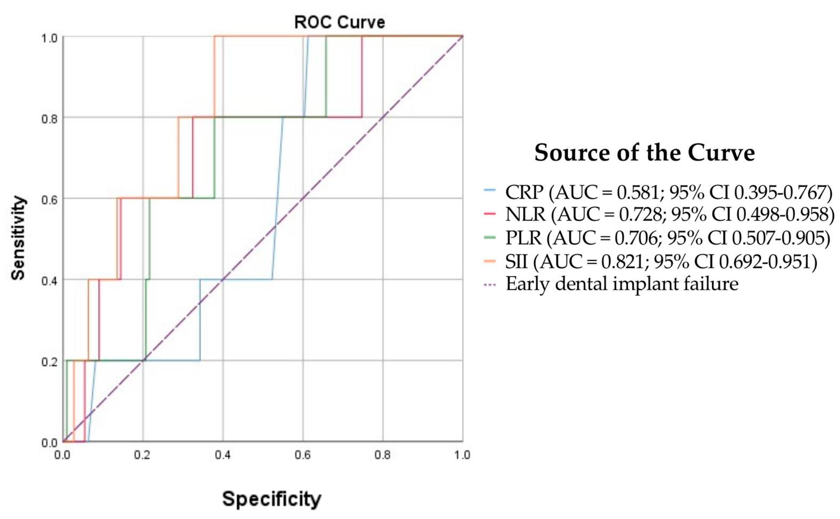 - SII (AUC = 0.821, SE = 0.066, 95% CI 0.692–0.951, p = 0.015) demonstrated good discrimination; the result was statistically significant.