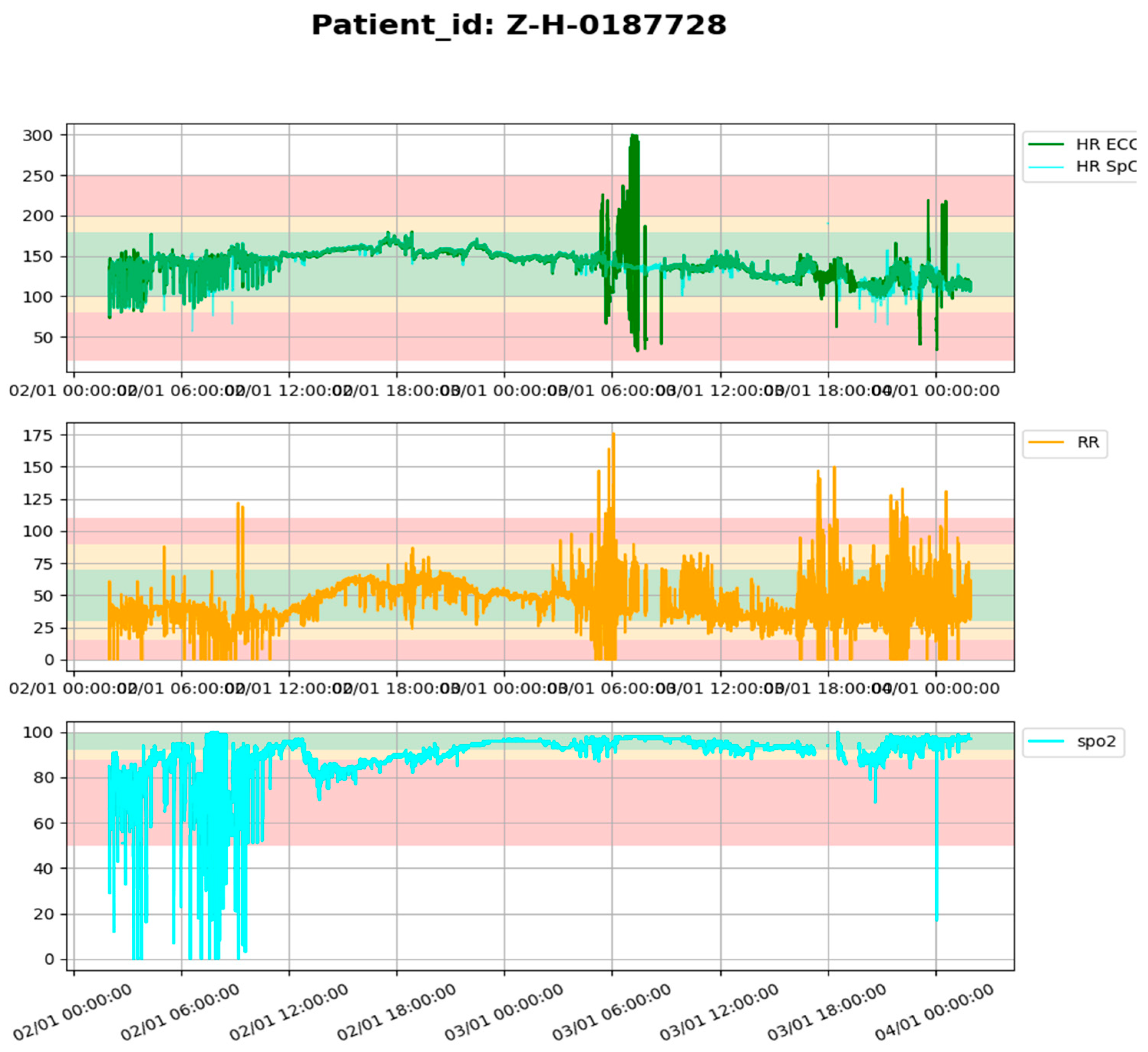 Figure 1, is specifically designed to capture and store real-time vital sign data, offering a comprehensive overview of a patient’s physiological parameters. These vital sign parameters include ECG heart rate, blood pressure, ECG respiratory rate, oxygen saturation (SPO2), SPO2HR, and temperature, which are all essential for monitoring patients in critical conditions. The parameters were recorded every second, creating a rich time series dataset. For our study, we focused on analyzing the following vital signs for threshold alarm analysis: ECG heart rate (ECGHR), ECG respiratory rate (ECGRR), and oxygen saturation (SPO2). We also used critical illness event data, which we extracted from the clinical group and annotated using RedCap, and the data included patient ID, critical illness event (CIE), and the date and time of its occurrence.