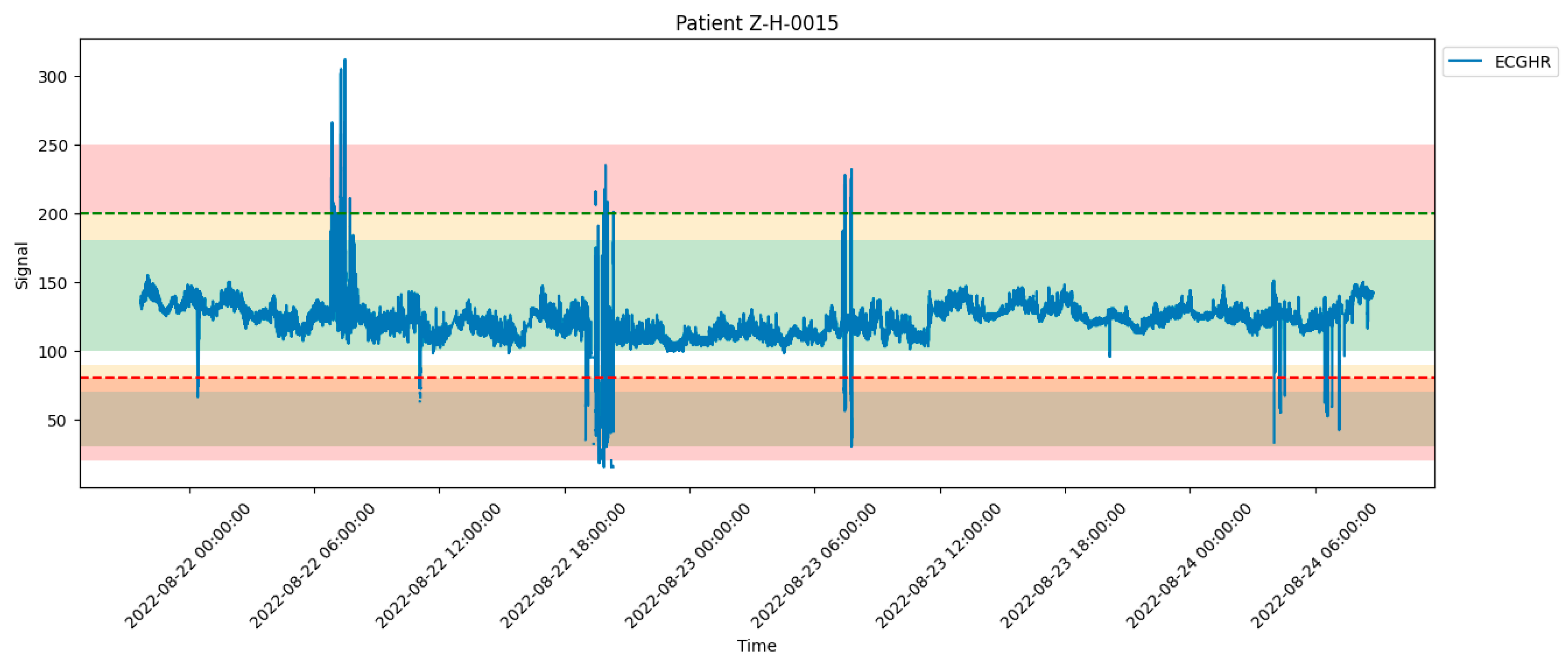 Visualization of ECGHR signal distribution for the patient throughout their 24-h monitoring period; we generated our threshold alarms using the pre-determined age cut-off threshold. The dash lines represent the threshold cut offs.