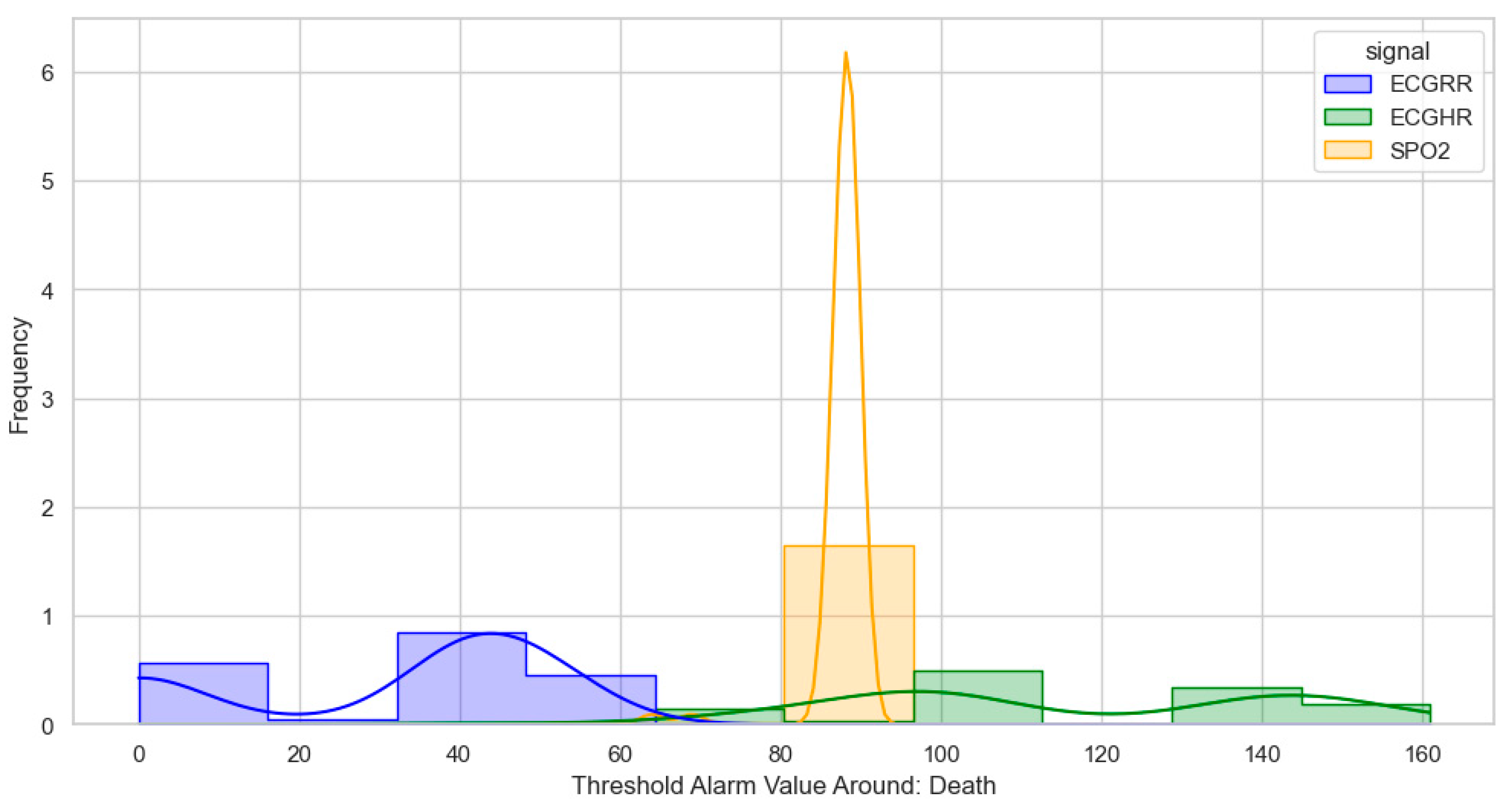 The analysis provided valuable insights into alarm patterns linked to critical illness events, specifically death and sepsis. By leveraging a DBSCAN clustering algorithm, we identified meaningful spatial patterns in the distribution of alarms based on the signal threshold value and the duration during which they are mostly distributed. For example, distinct threshold ranges were observed for ECGRR, ECGHR, and SPO2 signals preceding death and sepsis, revealing actionable patterns that could guide clinical responses. The random forest classifier proved highly effective in identifying these patterns, especially under WHO threshold alarms, achieving an accuracy of 93% for death and sepsis predictions, with consistently high precision, recall, and F1 scores. Of course, the algorithm performed better using GOAL3 threshold alarms, with a 90% accuracy and with minimal and manageable alarms, which can help in directing caregivers’ attention to the threshold alarms, since there will be a manageable number of alarms. The random forest classifier demonstrated a greater robustness and practicality for real-time monitoring applications, particularly in settings with limited technology resources, compared to other models. Implementing such models on patient monitors could empower caregivers to make timely interventions and decisions, ultimately improving patient outcomes by prioritizing early detection and response to critical illness events. However, further research is needed to refine it into a prediction model that includes all vital signs.