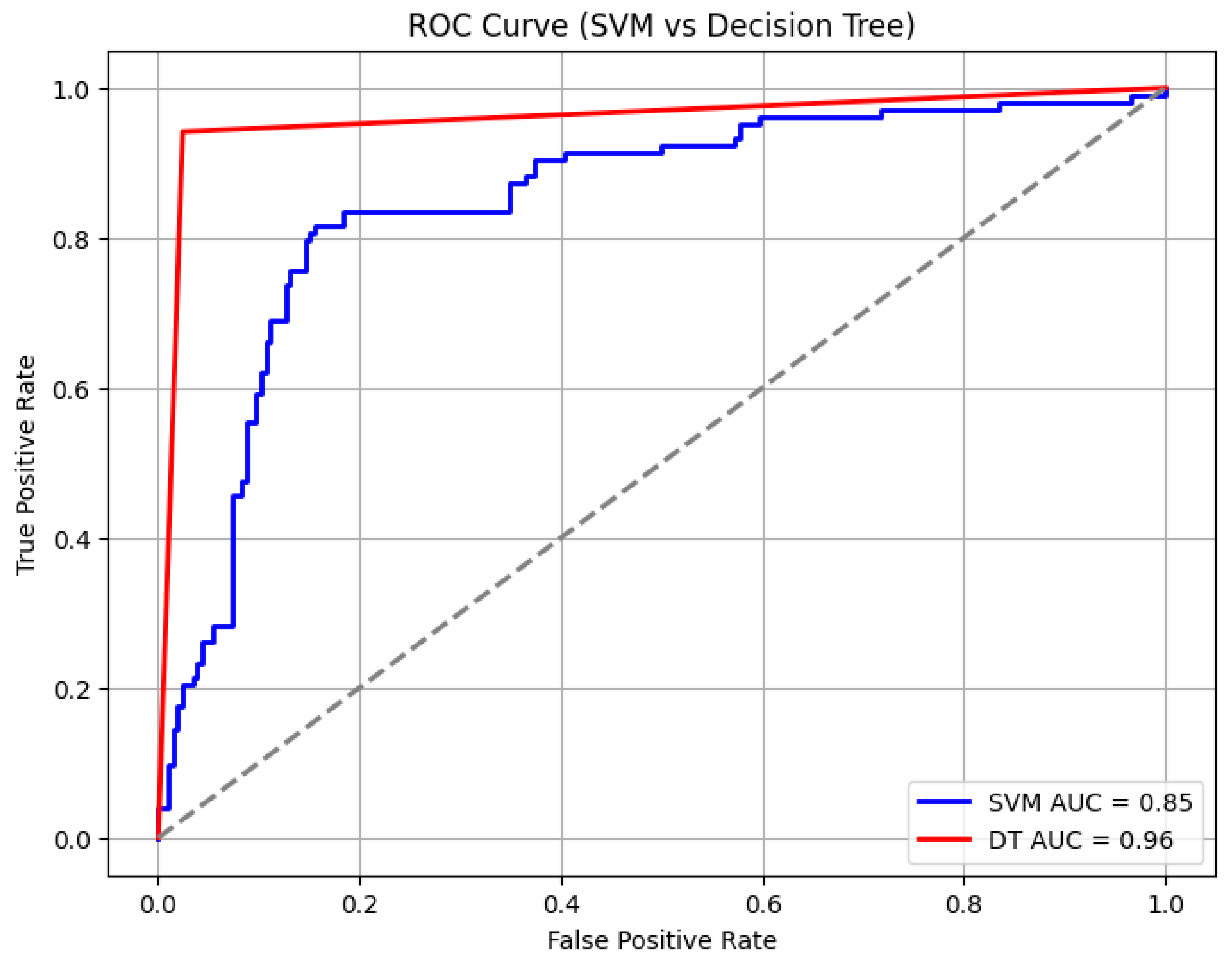Table 5). In comparison, the support vector machine (SVM) and decision tree (DT) algorithms achieved AUCs of 85% and 96%, with overall accuracies of 85% and 94%, respectively (
