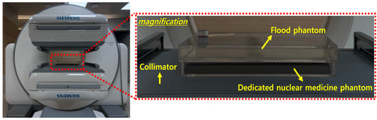 Prior to image acquisition, daily quality control procedures, including uniformity and energy calibration verification using a Tc-99m flood source, were performed following the manufacturer’s standard protocol. The system dead time was confirmed through count rate linearity tests. The experiment utilized a dual-headed gamma camera (Symbia Intevo Bold SPECT; Siemens, Munich, Germany). Figure 2 shows the experimental setup, which includes the low-energy high-resolution (LEHR) collimator and a NaI(Tl) scintillation crystal with dimensions of 59.1 cm × 44.5 cm and a thickness of 0.9525 cm. The LEHR collimator features hexagonal holes with a length of 2.405 cm and a septal thickness of 0.016 cm. Additionally, a flood phantom injected with 37 MBq of Tc-99m (140 keV) was positioned on the detector. Hoffman, Derenzo, and quadrant bar phantoms were positioned, and images of each phantom were acquired for 60 s under equal-time conditions without count normalization. The energy window was adjusted to 122 keV ± 10%, 140 keV ± 10%, and 159 keV ± 10%, respectively, so that variations in photon counts reflected intrinsic differences between the photopeak and scatter fractions rather than inconsistencies in system performance. Furthermore, a flood phantom image was acquired to evaluate uniformity according to the applied energy window. Planar image of each phantom was obtained using one detector of the gamma camera, with a matrix size of 256 × 256, a zoom factor of 2.0, and a pixel size of 2.39 × 2.39 mm2. Each experiment was repeated five times independently to minimize random variations and to ensure statistical reliability.