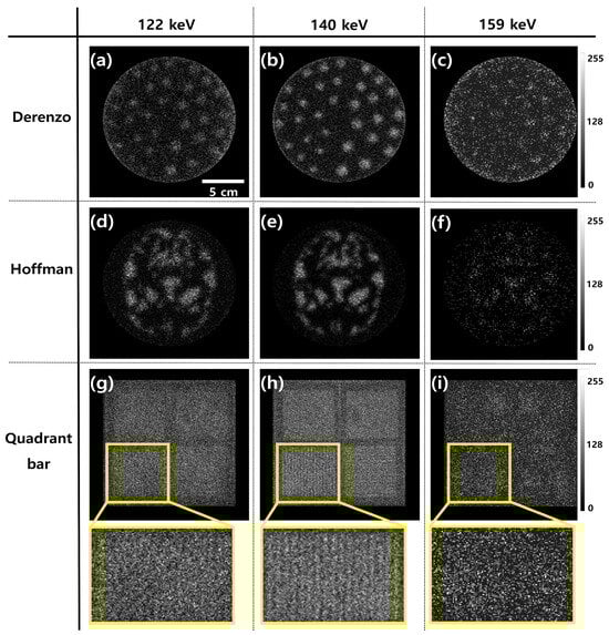 Acquired images showcasing (a–c) Derenzo phantoms, (d–f) Hoffman phantoms, and (g–i) quadrant bar phantoms, including magnified views of the 3.5 mm bar thickness, captured at energy levels 122, 140, and 159 keV, respectively, all of which include a 5 cm scale bar and are displayed with a consistent color map representing count distributions normalized to the maximum pixel intensity of each image.