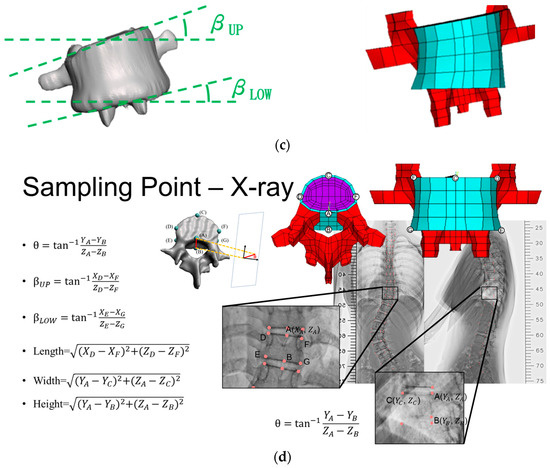 - Coordinates of the superior posterior points of each vertebral body and vertebral body length along the three axes (Figure 2a);