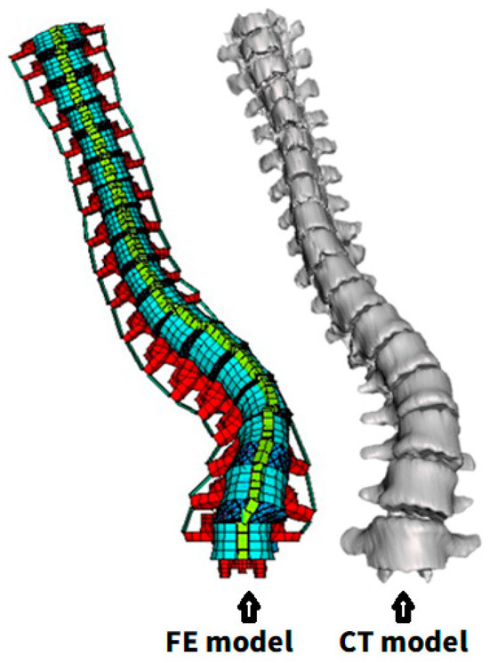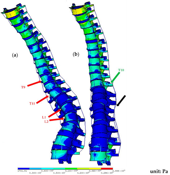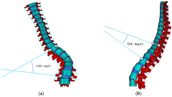 - Zhang, Q.; Chon, T.E.; Zhang, Y.; Baker, J.S.; Gu, Y. Finite element analysis of the lumbar spine in adolescent idiopathic scoliosis subjected to different loads. Comput. Biol. Med. 2021, 136, 104745. [Google Scholar] [CrossRef]
