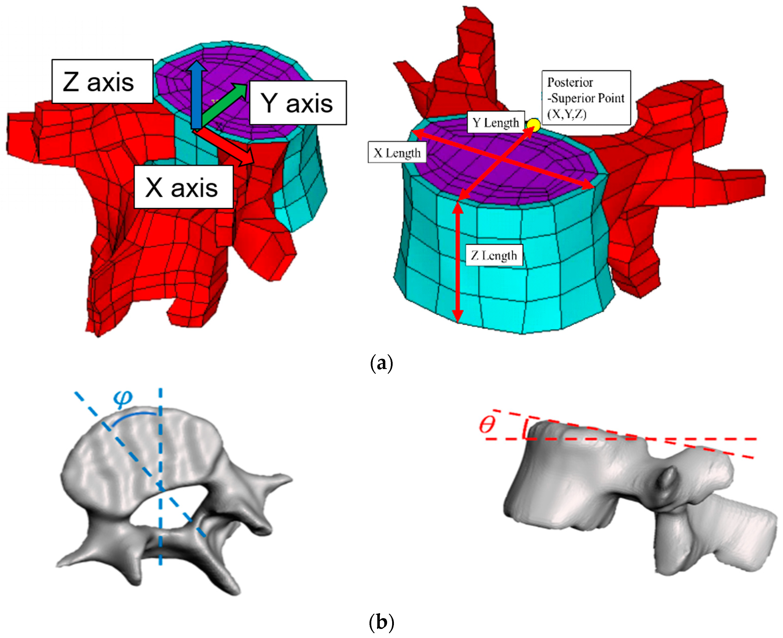 - X, Y, and Z: new nodal coordinate in a new vertebral body after rotating an angle of φ (transverse plane)