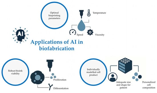 Applications of artificial intelligence (AI) in biofabrication. AI algorithms can optimize bioprinting parameters such as temperature, speed and viscosity; predict bioink viability by modeling cell proliferation and differentiation; and design individualized cell products with personalized size and cellular composition tailored for each patient.