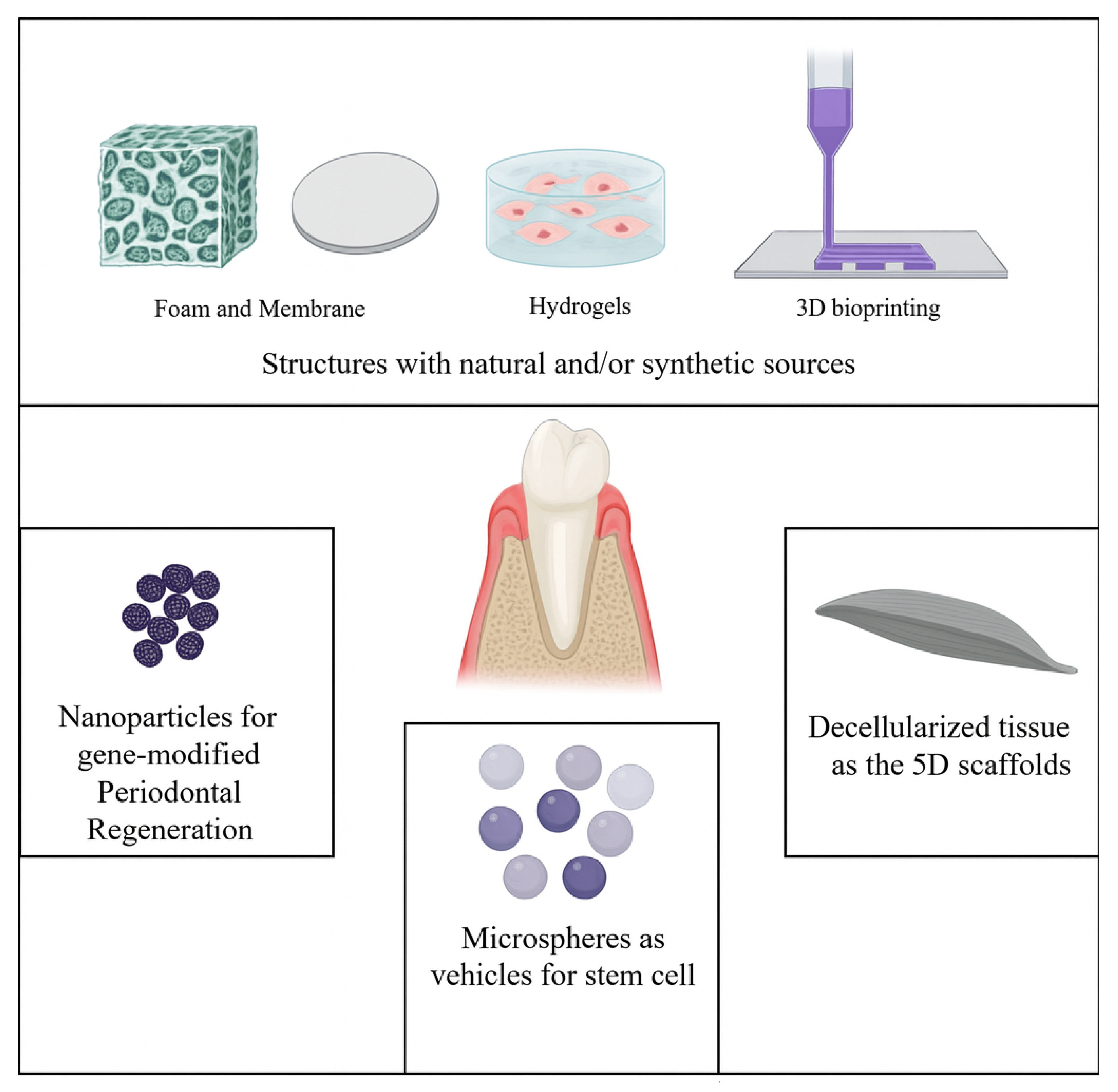 - Acharya, J.R.; Kumar, S.; Girdhar, G.A.; Patel, S.; Parekh, N.H.; Patadiya, H.H.; Zinjala, A.N.; Haque, M. 3D Bioprinting: Shaping the Future of Periodontal Tissue Regeneration and Disease Management. Cureus 2025, 17, e82432. [Google Scholar] [CrossRef]