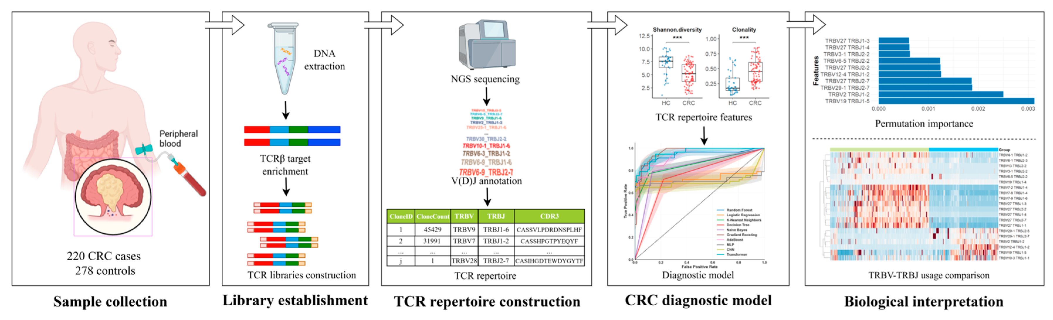 Chicago/Turabian StyleZhu, Gaochen, Tao Chen, Chen Ma, Kai Liu, Bihui Huang, and Guan Yang. 2025. "Peripheral Blood TCR Clonotype Diversity as a Biomarker for Colorectal Cancer" Bioengineering 12, no. 11: 1215. https://doi.org/10.3390/bioengineering12111215