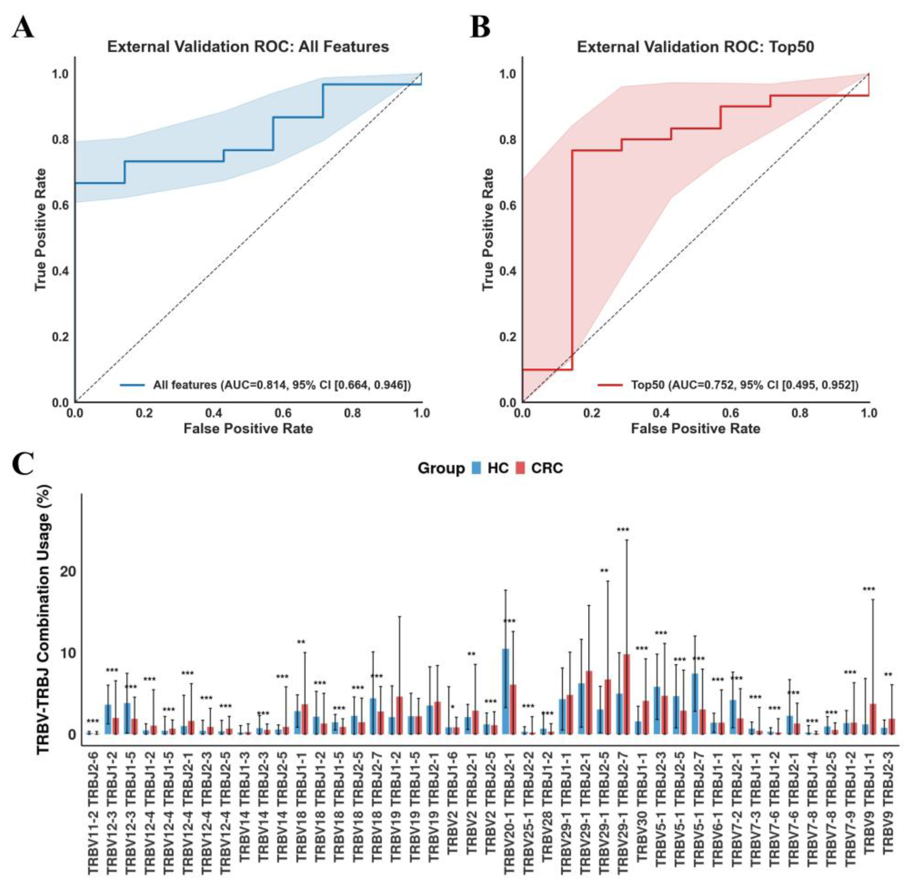 3.4. Validation of TCR Repertoire-Based Models for CRC Diagnosis in Independent Cohorts