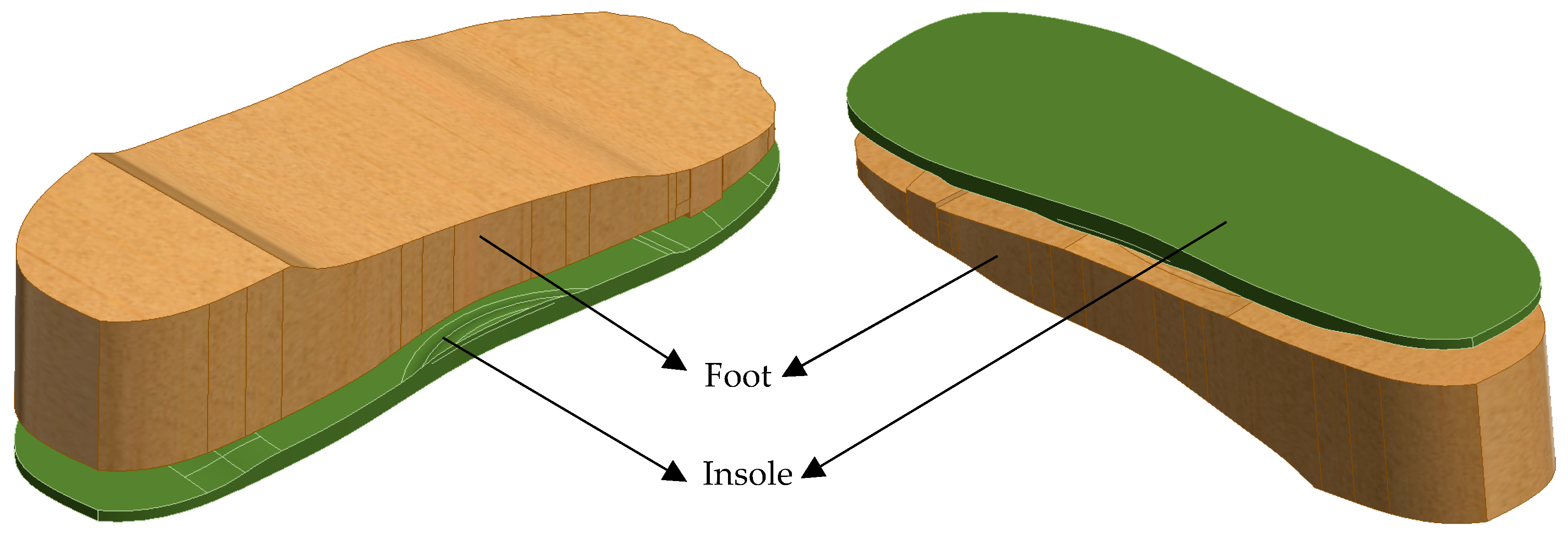 - Niu, J.; Liu, J.; Zheng, Y.; Ran, L.; Chang, Z. Are Arch-Conforming Insoles a Good Fit for Diabetic Foot? Insole Customized Design by Using Finite Element Analysis. Hum. Factors Ergon. Manuf. Serv. Ind. 2020, 30, 303–310. [Google Scholar] [CrossRef]