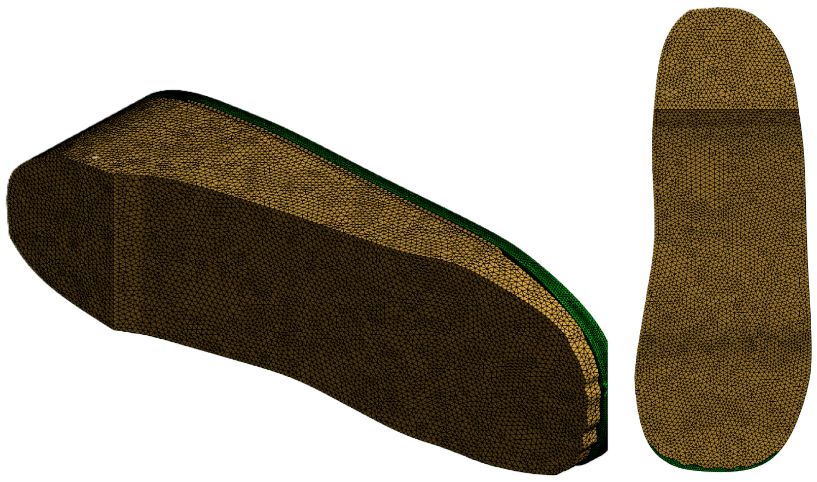 - Assigning Material Properties: EVA1, EVA2, EVA3, and PU material properties, as listed in Table 1, are selected from the ANSYS library and applied to the imported insole models. In the Engineering Data section, a new material is defined with the linear elastic material properties listed in Table 2 to assign foot material properties to the imported foot model.