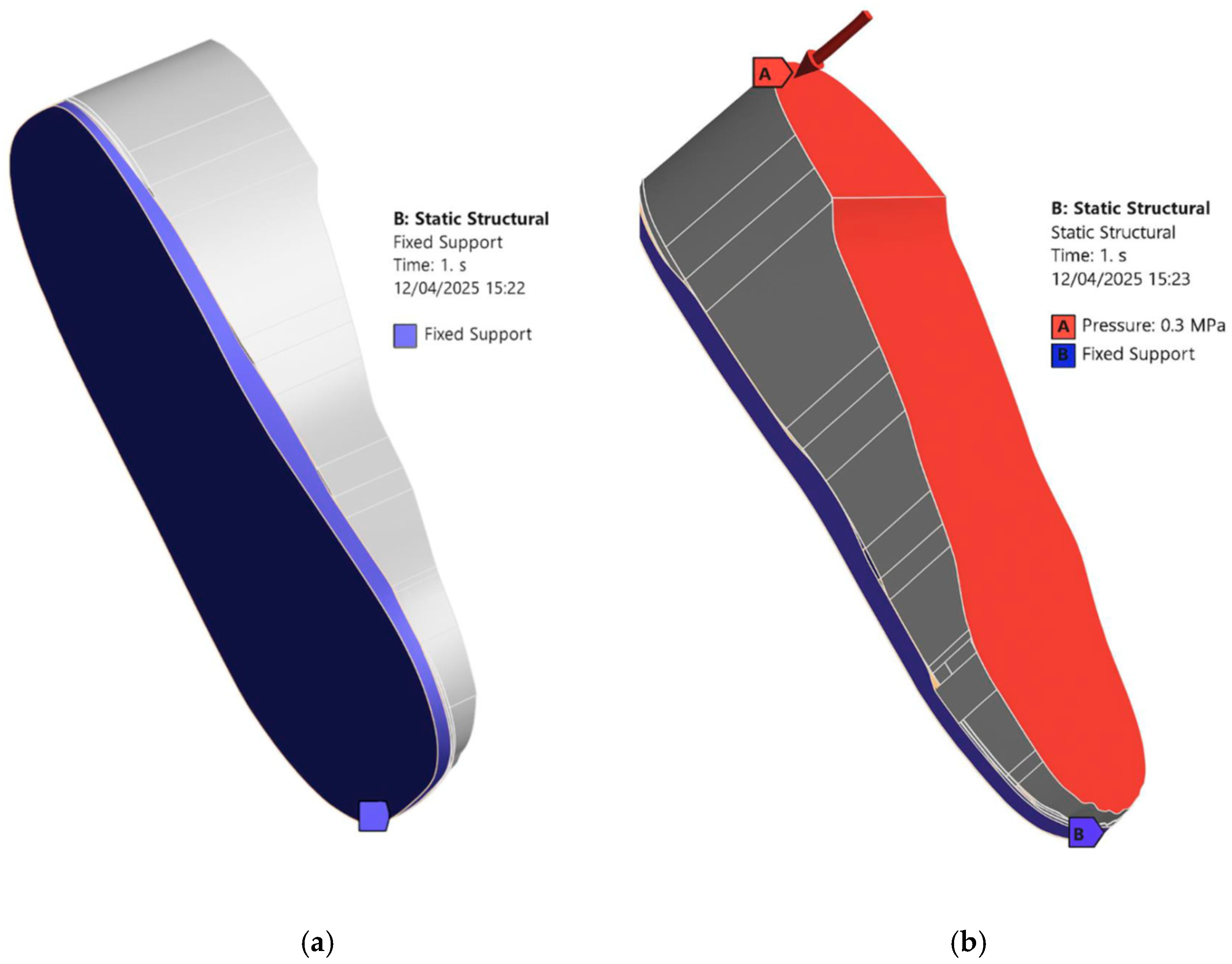 - Loading and Boundary Conditions: In the Static Structural module, a fixed support is applied to the bottom of the insole and side edges that would be in contact with the ground or shoe interior [see Figure 6a]. A pressure load is applied to the top surface of the foot as shown in Figure 6b. The magnitude of the applied pressure is set to 0.1 MPa, 0.2 MPa, and 0.3 MPa to represent different stance loading conditions. These values are chosen based on the magnitudes considered in the study of Ref. [23] to simulate plantar pressures applied to the diabetic feet under static loading conditions. Selecting this range allows us to stay within physiologically relevant loading scenarios and observe how the insole material and design influence the stress distribution. Figure 6 describes the applied loading and boundary conditions.