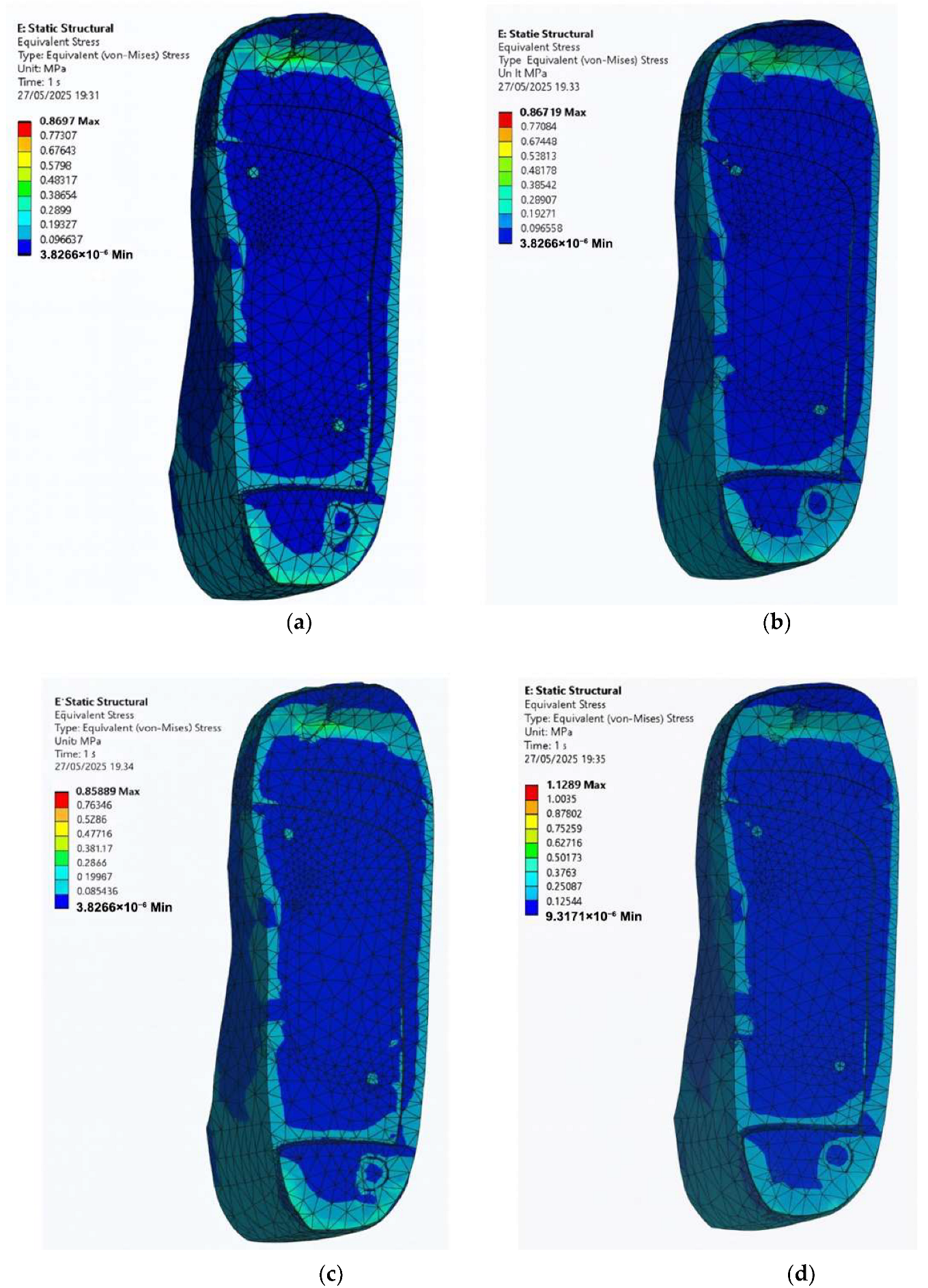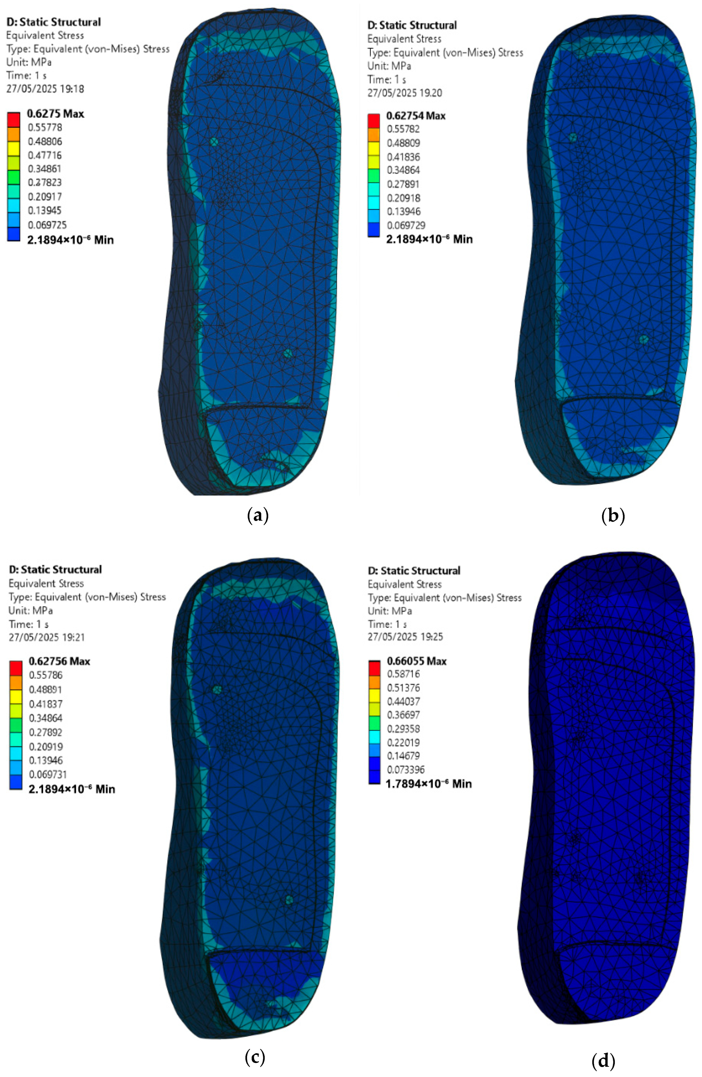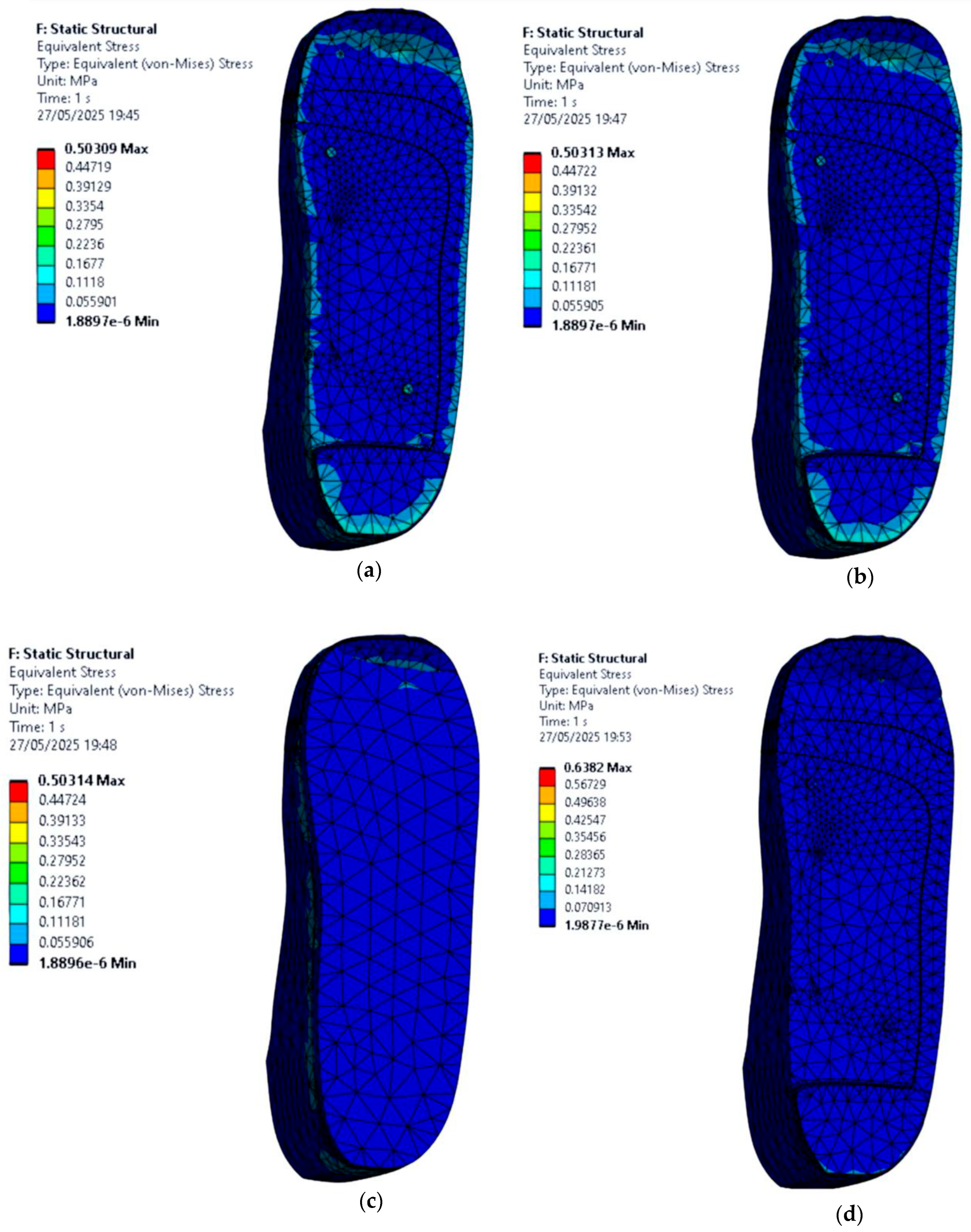 - Customised Insole Geometry and Plantar Stress Reduction: When the diabetic foot was simulated in a barefoot condition on a hard and flat ground surface, the peak von Mises stress reached 3.97 MPa. When supported by a customised insole made of EVA1, the stress dropped to 1.51 MPa, representing a 61.96% reduction. This confirms that using insoles can meaningfully offload pressure in high-risk regions such as the heel and forefoot, which is critical for ulcer prevention.
